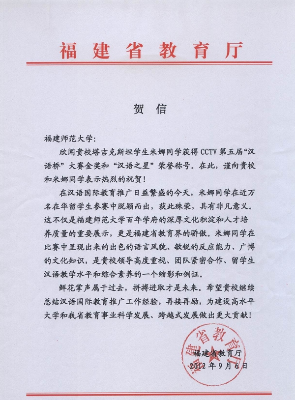 福建省教育厅致信祝贺OD(中国)一站式服务平台米娜同学获得第五届“汉语桥”大赛金奖