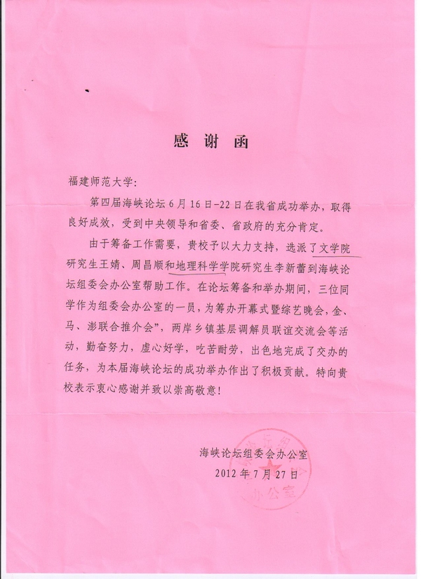 海峡论坛组委会致信感谢OD(中国)一站式服务平台学生为第四届海峡论坛成功举办作出贡献