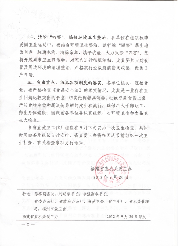 现将《福建省直机关爱国卫生运动委员会办公室关于做好国庆环境卫生工作的通知》(闽直爱卫[2012]8号)转发给你们,请按照通知要求做好国庆环境卫生工作。宣传部和校医院牵头做好秋季卫生常识的宣传教育工作。相关单位要做好办公楼、办公室、教学楼、实验室、宿舍楼及包干区卫生工作;结合秋季特点做好食堂卫生、食品安全工作;做好校园环境整治和除“四害”等工作。