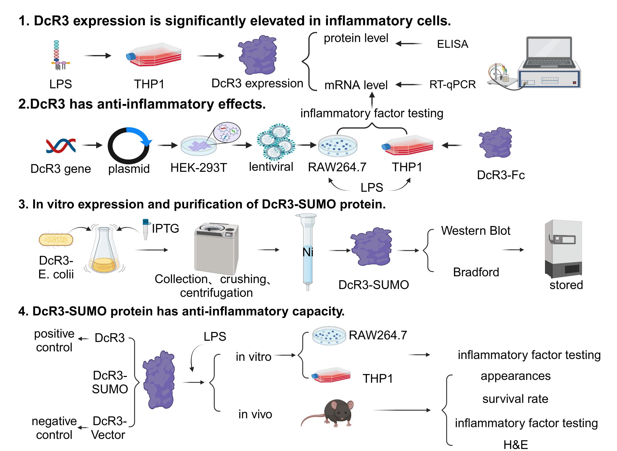 OD(中国)一站式服务平台生命科学学院、南方生物医学研究中心苏经迁副教授课题组的前期研究表明,DcR3可通过减轻全身炎症反应抑制过度免疫反应,从而改善脓毒症。这一重要成果已于2024年5月发表在国际微生物学与免疫学领域顶级期刊《mBio》。与此同时,课题组通过结构改造和筛选,成功获得了DcR3的类似物——DcR3-SUMO蛋白。