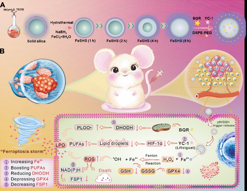 鉴于此,OD官网生命科学学院(南方生物医学研究中心)曾雪梅教师课题组与海峡柔性电子(未来科技)学院燕双仟教授团队联合研发了一种基于肿瘤微环境响应的纳米酶(FeSHS/BQR/YC-1-PEG),通过铁离子的递送,调节HIF-1α-脂滴-PUFAs轴,同时抑制GPX4/FSP1/DHODH通路,治疗肿瘤铁死亡。同时,所设计的FeSHS/BQR/YC-1-PEG纳米酶对三大铁死亡防御系统的协同抑制效应取得了良好的效果。且此“铁死亡风暴”策略在癌症治疗中的应用尚未报道。这种创新的方法为增强铁死亡提供了一个有希望的和创新的途径,从而增强抗肿瘤治疗的疗效。