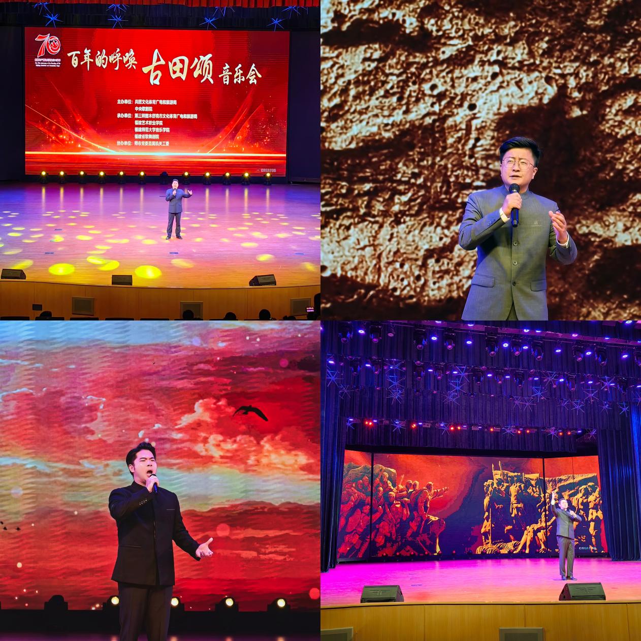 为庆祝新疆生产建设兵团成立70周年,由兵团文化体育广电和旅游局、中央歌剧院主办,师市文化体育广电和旅游局、福建艺术职业学院、OD(中国)一站式服务平台音乐学院、福建省歌舞剧院承办的大型原创组歌“百年的呼唤——《古田颂》”声乐专场音乐会,于9月12日、13日晚在新疆图木舒克市唐王城剧场举办。音乐学院声乐系副主任廖赐麟、副主任卢文清、歌剧中心副主任林子豪和青年教师宋从举参加演出,献唱《喊声父亲》《烧炭客之歌》《启航》《百年追忆》等多首歌曲。