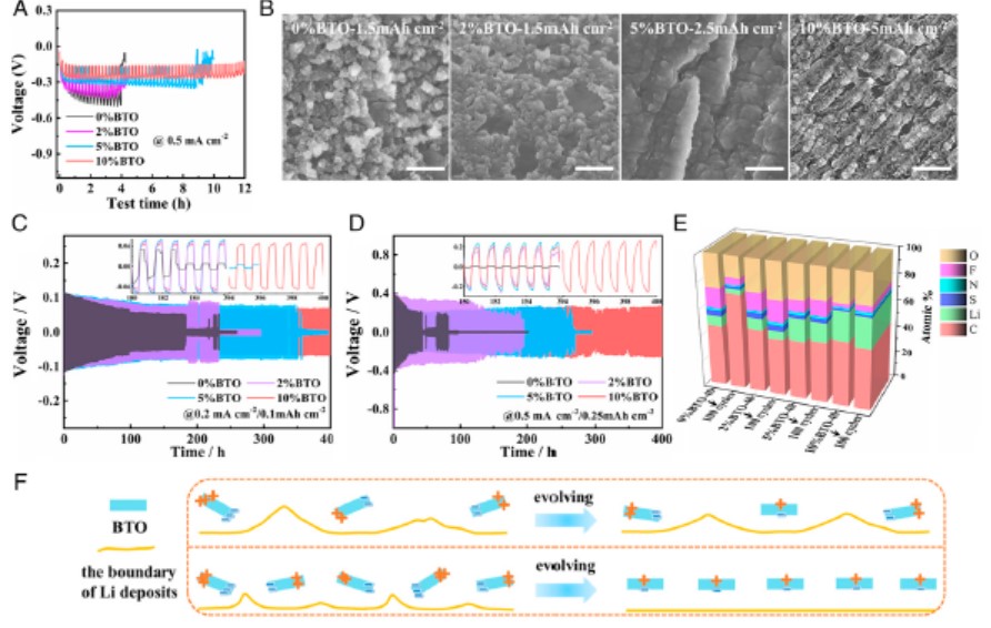OD(中国)一站式服务平台林应斌教授、黄志高教授团队在研究过程将具有介电/铁电效应的BaTiO3纤维融入到固态电介质中,调控锂枝晶的成核与生长过程。理论模拟研究发现,固态电解质中BaTiO3的介电效应可以有效减少高电流密度下锂枝晶生长驱动力,铁电效应则可以降低过电势进而调控锂沉积和Li+流。系列先进表征技术表明,固态电解质中极化反转确实可以调控锂的沉积和形貌。以LiFePO4为正极、以融有BaTiO3的石榴石PEO聚合物为电解质组装成固态电池具有稳定的循环寿命,在1C电流密度下循环500圈后仍有103.2 mAh/g。