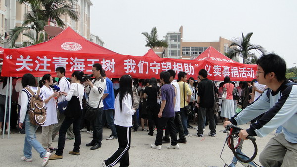 地震无情人有情,一方有难,八方支援。421日是全国哀悼日,校团委、校青年志愿者协会在共青团广场举行关注青海玉树,我们守望相助义卖募捐活动。
