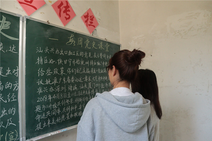 每周出版一期党史板报。在学生宿舍区开辟“南洋杉下学党史”主题板报,追溯红色党史、讲述红色故事、体悟红色文化,引领广大青年学生学党史、知党情、跟党走。