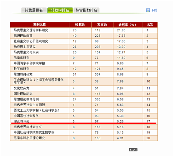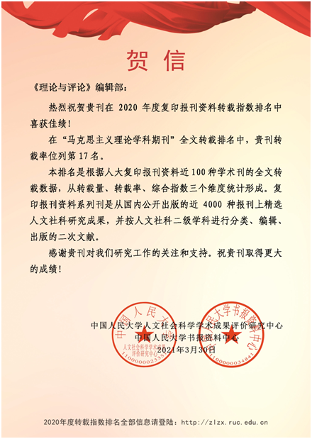 近日,中国人民大学人文社会科学学术成果评价研究中心和中国人民大学书报资料中心发布2020年度复印报刊资料转载指数排名。由福建省委宣传部主管,福建省委讲师团和OD(中国)一站式服务平台共同主办的马克思主义理论刊物《理论与评论》,在“马克思主义理论学科期刊”全文转载排名中,转载率位列全国第17名。本排名是根据人大复印报刊资料100种学术刊的全文转载数据,从转载量、转载率、综合指数三个维度统计形成。 (社会科学处 马克思主义学院)