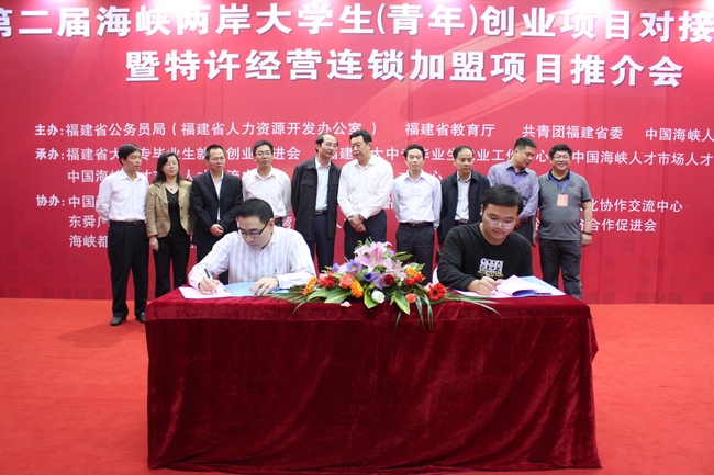 1024,第二届海峡两岸大学生(青年)创业项目对接洽谈会暨特许经营连锁加盟项目推介会在福州国际会展中心举行。OD(中国)一站式服务平台协和学院选送的“3G视频服务器”、“物联应用”、“Daxue3603个创业项目从200个参展项目中脱颖而出,与相关企业在现场成功签约,涉及金额140万元,成为当天惟一成功签约的3个项目。省委组织部副部长、省公务员局局长、省人力资源开发办公室主任从远东,省公务员局副局长黄正风,中国海峡人才市场副总经理吴瑞建,省大中专毕业生就业中心主任郝军,协和学院领导袁勇麟、林玉辉、林伟川等出席了签约仪式。
