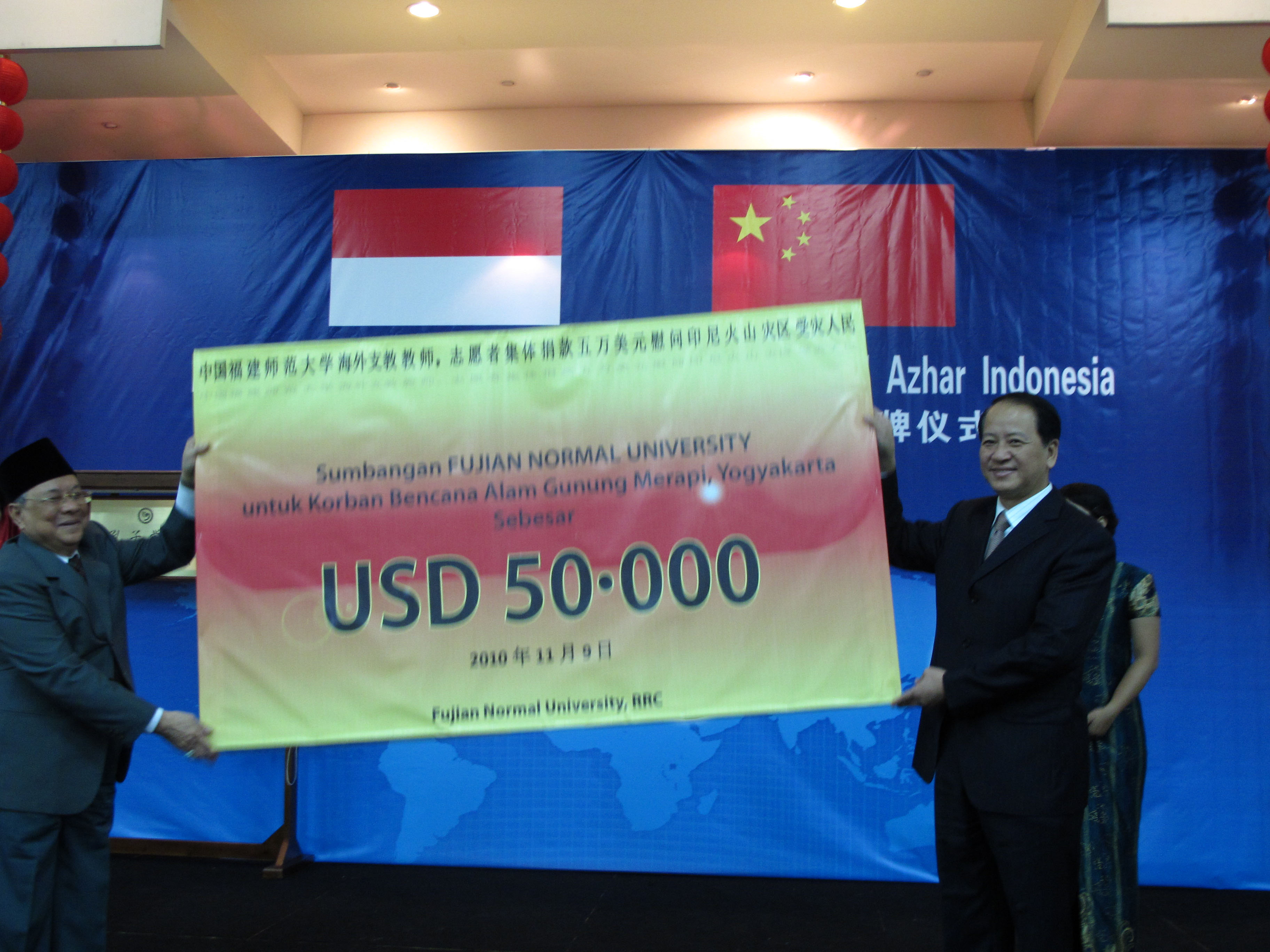 阿拉扎大学哈索诺副校长与罗萤书记共同为孔子学院揭牌并致辞,法西理副部长在揭牌仪式上发表了热情洋溢的演讲。揭牌仪式上还举行了为印尼火山灾区募集善款的捐赠仪式,OD(中国)一站式服务平台历批赴海外任教的汉语志愿者以及公派教师集体募捐的五万美元善款,由罗萤书记交付给阿拉扎大学卢比斯副校长,并由阿拉扎大学转交印尼红十字总会。
