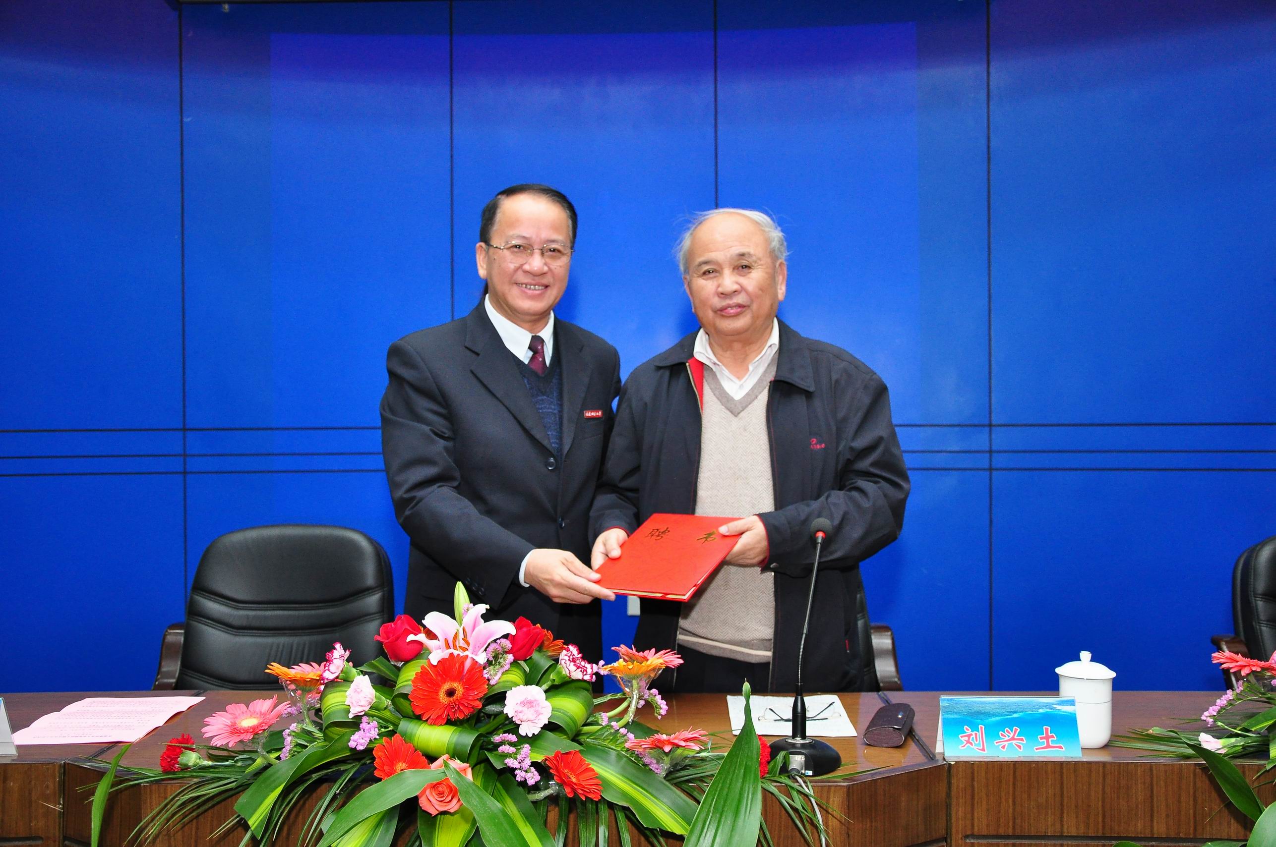 汪文顶副校长介绍了刘兴土院士的学术简历、宣读了聘任决定,罗萤书记代表学校致词,并为刘兴土院士颁发聘书、佩戴校徽。