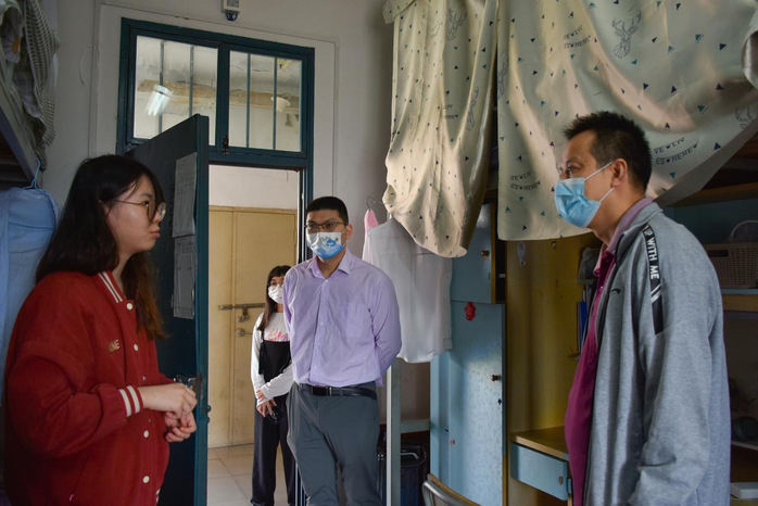 在宿舍楼,学院领导询问同学们线上上课的情况,听取同学们对线上教学的意见和建议,并嘱咐同学们在疫情期间要养成规律作息的好习惯,保持学习热情,遵守课堂纪律,高质量完成任课教师布置的作业,确保线上上课的教学质量。