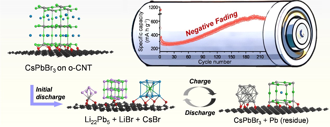 近日,OD官网吴小慧副教授等人通过各种原位/非原位技术全面研究了CsPbBr3的结构演变,揭示了其在锂化过程中通过插层-转化-合金反应产生 CsBr、LiBr、Pb和Li22Pb5相,并在充电过程中可逆形成CsPbBr3。此外,将CsPbBr3颗粒嵌入导电碳纳米管(o-CNT)中,可充分利用其逆衰减现象。综合实验和理论分析表明,CsPbBr3增强的逆衰减现象主要源于两方面:负载在o-CNT 上的残留 Pb金属的锂合金化反应以及循环过程中活性材料尺寸减小的导致的增强赝电容贡献。因此,这项工作不仅揭示了CsPbBr3的电化学(脱)锂化机制,还提出了一种有效的策略来增强卤化物钙钛矿材料的“逆衰减”效应,以实现优异的储锂性能。相关研究成果发表于《Energy Storage Materials》上。