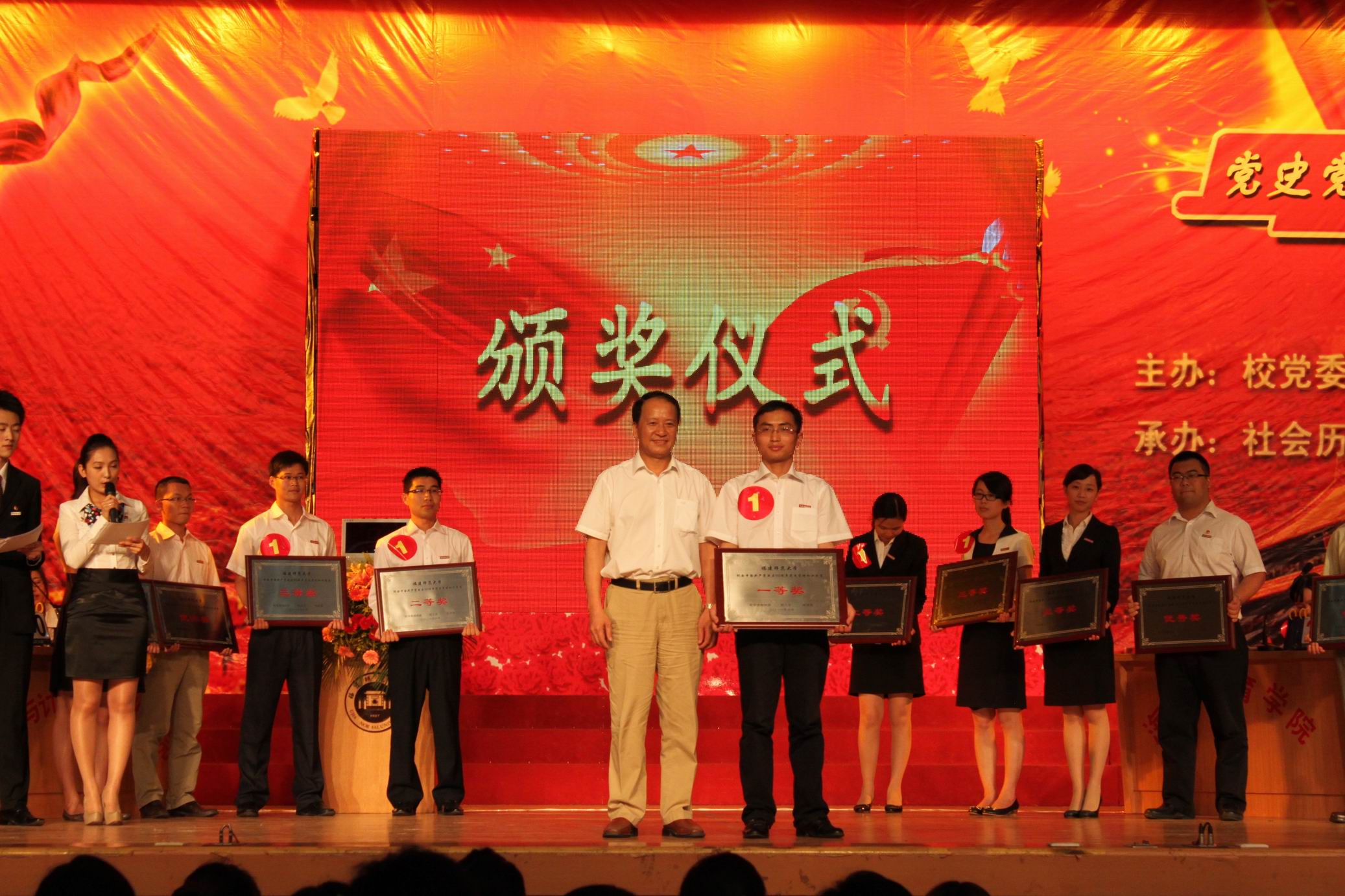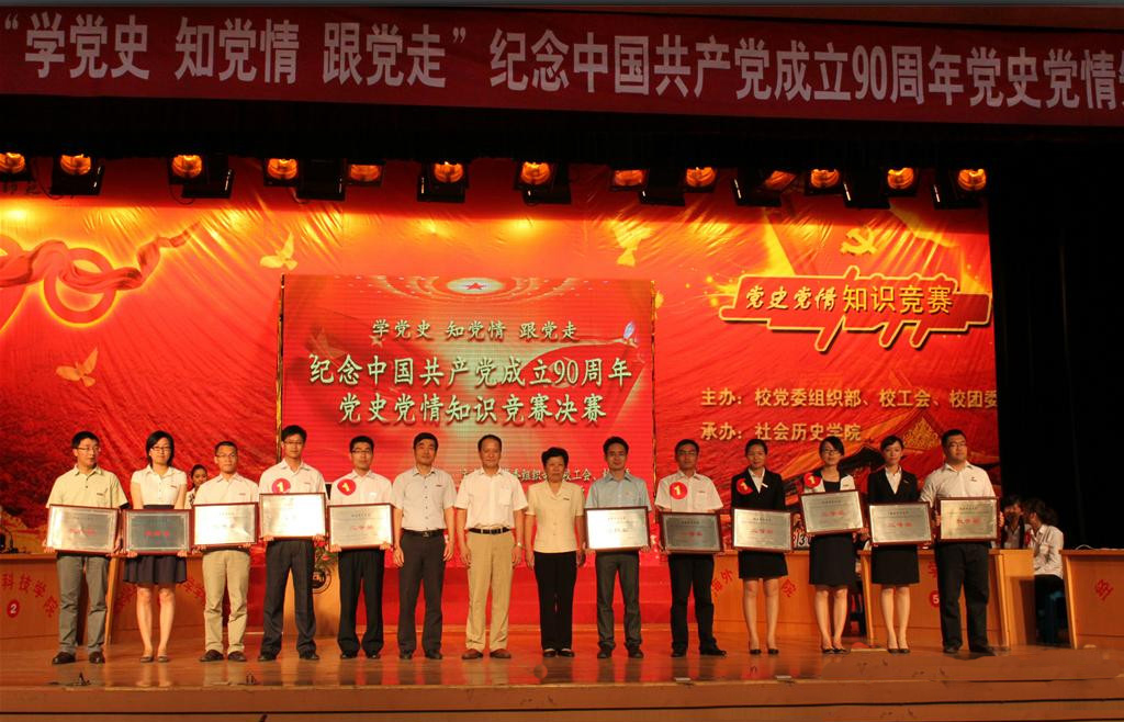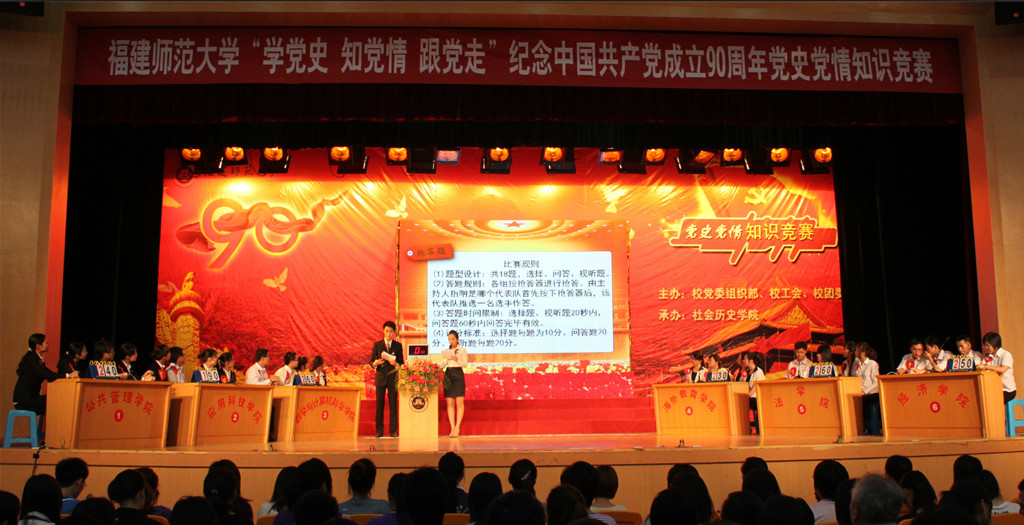 为纪念中国共产党成立90周年,引导全校师生进一步坚定跟党走中国特色社会主义道路的理想信念,6月1日下午,由校党委组织部、校工会、校团委主办,社会历史学院承办的“学党史、知党情、跟党走”纪念中国共产党成立90周年党史党情知识竞赛决赛在旗山校区青春剧场举行。校领导罗萤、游小波、许歌平,校党建工作领导小组成员,校关工委负责人,各学院党委负责人、工会主席、团委书记,师生代表共计1000余人现场观摩了决赛。社会历史学院