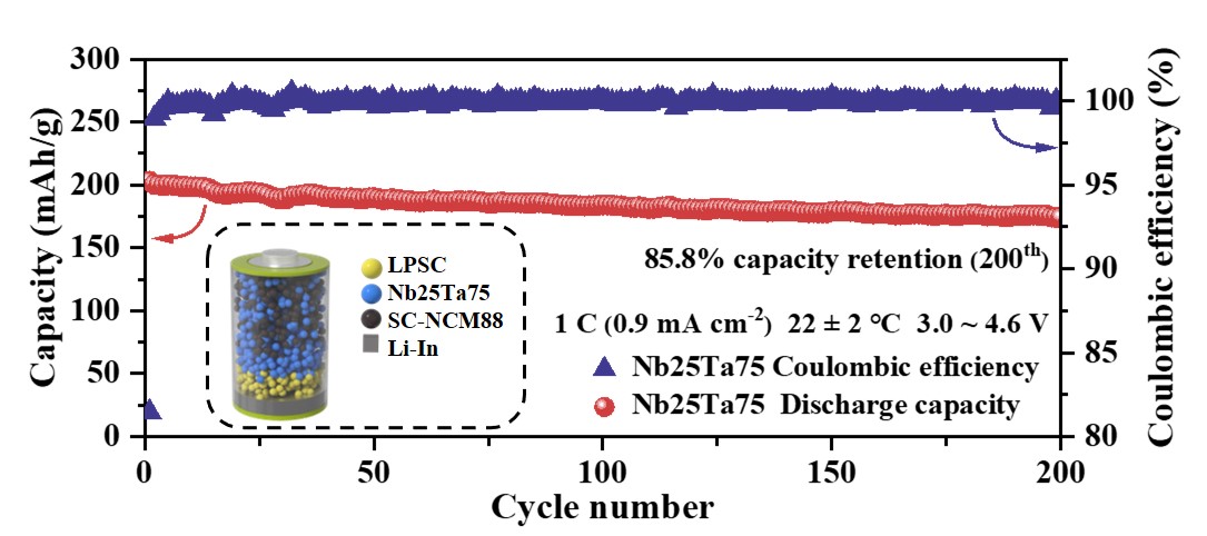 近日,OD(中国)一站式服务平台物理与能源学院张隆教授、黄志高教授等人提出钽/铌(Ta/Nb)共占据策略,开发出一种氟化卤化物固态电解质(Li3NbxTa1-xCl5OF),并实现短时间的球磨制备工艺。通过优化Ta/Nb比例,该电解质获得高离子电导率(3.07 mS /cm)和宽电化学窗口(>4.6 V vs. Li+/Li)。实验结果表明,Ta/Nb共占据显著提升了材料的氧化稳定性,并赋予其低杨氏模量和柔性特征,能适应充放电体积变化,保持正极与电解质的紧密接触。以此电解质组装的全固态锂电池,在4.6 V高电压下,采用SC-NCM88正极展现出202.9 mAh g-1的高比容量,经过200次循环后容量保持85.8%,1000次后仍有84.4%。