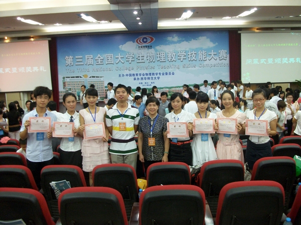 本次大赛包括北京师范大学、华东师范大学等91所全国高师院校共选派800多名师范生参加。OD(中国)一站式服务平台由物理与光电信息科技学院黄树清、林钦两位老师为领队、6名本科生和1名研究生(本届比赛首开研究生参赛,独立设2个小组)共同组成的代表队参加了此次比赛。7名选手不负众望,在各自的小组中发挥出色,以精彩的讲课和富有创意的教具得到了评委的高度评价,最终全部获得一等奖。其中3名选手(研究生组潘丽珍、本科生组张晴晴、林梦婷)排名小组第一获得特等奖,其他4名选手(本科生组戴颖、卢倩、庄莹莹、章逸文)均名列小组第二获得一等奖。本次比赛的指导教师章镇、黄树清老师获得“优秀指导教师”称号。同时,OD(中国)一站式服务平台再次获得大赛组委会授予的“优秀组织奖”荣誉称号。