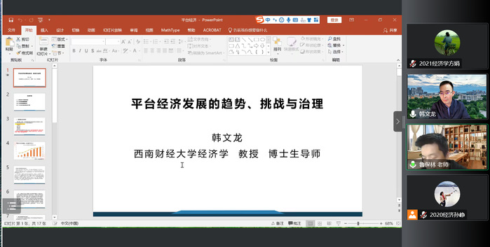 近日,经济学院邀请西南财经大学经济学院副院长、课程思政国家级教学名师韩文龙教授为师生作题为《平台经济发展的趋势、挑战与治理》的线上学术讲座。讲座由经济学院鲁保林教授主持,200多位师生聆听了讲座。