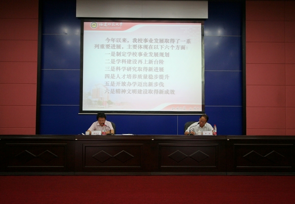 会上,黄汉升校长代表校党委、校行政通报了今年以来学校主要工作情况,同时对新学期工作作了全面部署。他指出,2011年是“十二五”规划的开局之年,全校师生员工在校党委的坚强领导下,在学校事业发展规划、学科建设、科学研究、人才培养、开放办学、精神文明建设等方面取得了新的进展。他强调,以上成绩的取得为学校向高水平大学迈进奠定了良好基础,实践证明,只要我们树立机遇意识,求真务实、真抓实干,聚精会神搞建设,一心一意谋发展,就能不断推动学校事业科学发展、跨越发展。