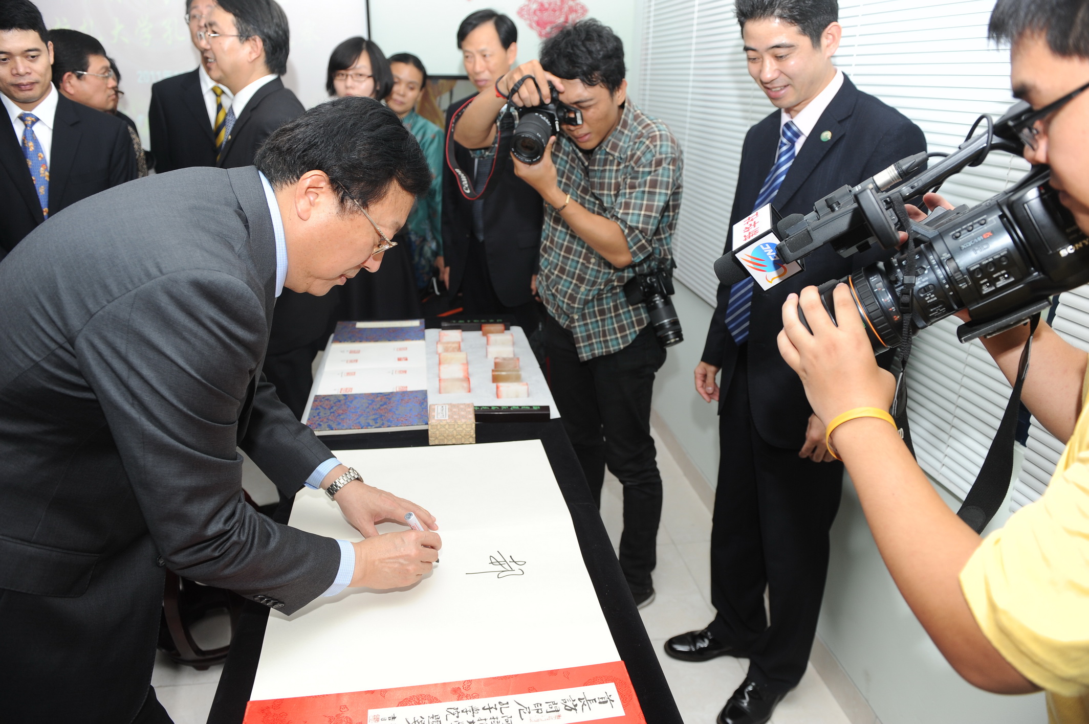 随后,郝平一行来到由印尼侨领黄双安捐建的阿拉扎大学孔子学院专用办学场所视察工作。在参观了孔子学院办学成果图片展后,他对学院在不到一年的时间内取得的显著成绩表示钦佩。郝平一行观摩了孔子学院课堂教学,参观了孔子学院办公室和中国文化阅览室。他认真观看了阿拉扎大学孔子学院学生的篆刻印章和篆刻作品集,对印尼学生能够在短短两天的时间内完成篆刻作品给予了很高的赞誉,并欣然为孔子学院题名留念。