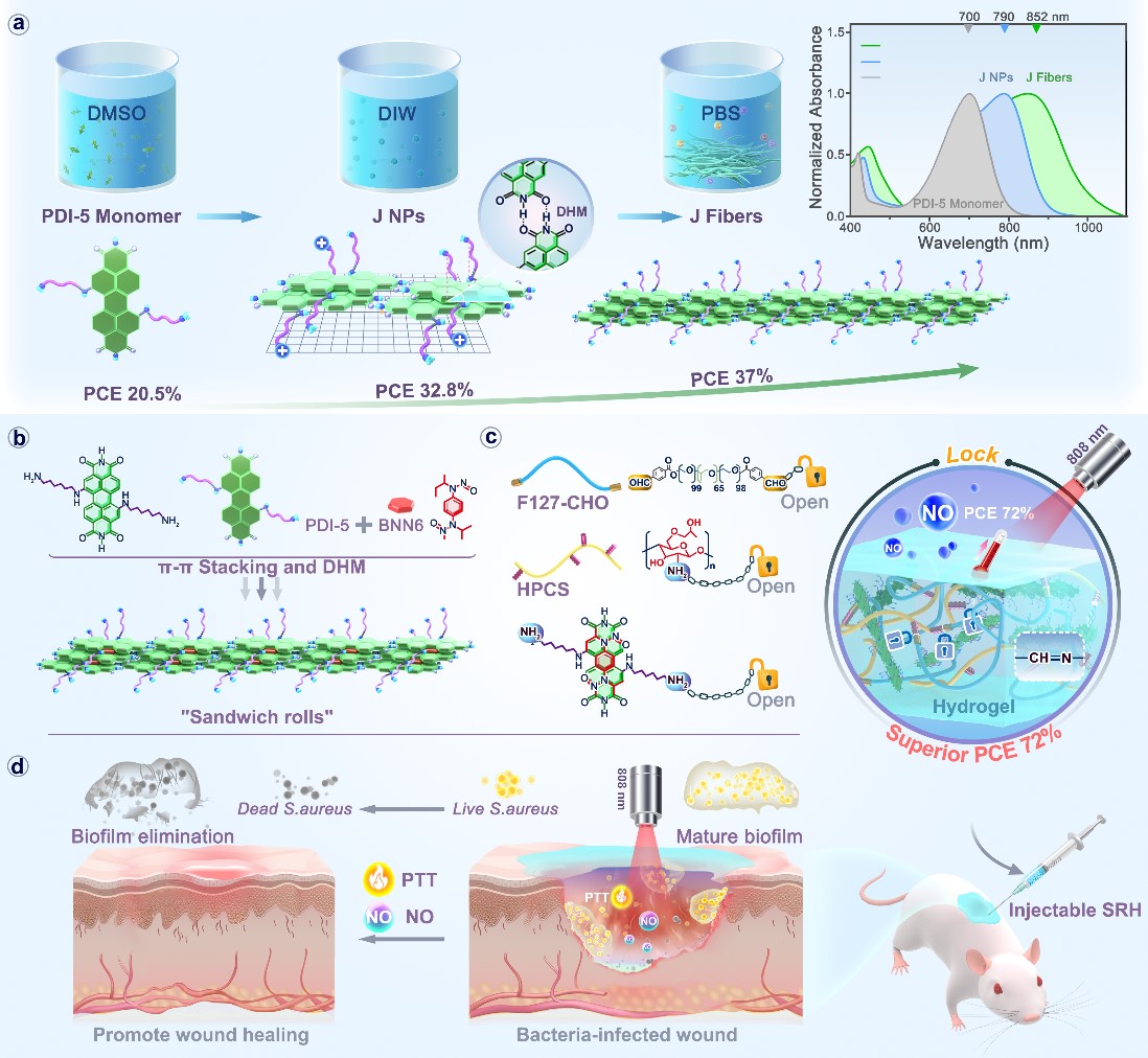 OD(中国)一站式服务平台海峡柔性电子(未来科技)学院杨震教授团队报告了一种基于NO供体BNN6的可注射水凝胶的策略,其中NO的释放可以通过半导体苝酰亚胺(PDI)J-聚集纤维的光热效果触发。合成的PDI衍生物可自组装成0维纳米颗粒,然后聚集成1维J聚集纤维,伴随着吸收峰从700 nm红移至790 nm,最终到852 nm。在封装BNN6后,形成了一种“三明治卷”(SR)状结构,均匀交联成一种可注射水凝胶(SRH),其光热转换效率高达72%,使得SRH能够实现高效的光控NO释放。SRH表现出优异的可注射性、形状适应性和对大肠杆菌和金黄色葡萄球菌的有效抗菌效果超过99%。通过激光照射,其在体内抗生物膜效率达到99.58%。此外,协同治疗显示出消除炎症、促进血管生成和促进胶原沉积的能力,从而显著刺激伤口愈合过程。这种半导体J-聚集可注射水凝胶可能成为治疗生物膜的多功能策略。