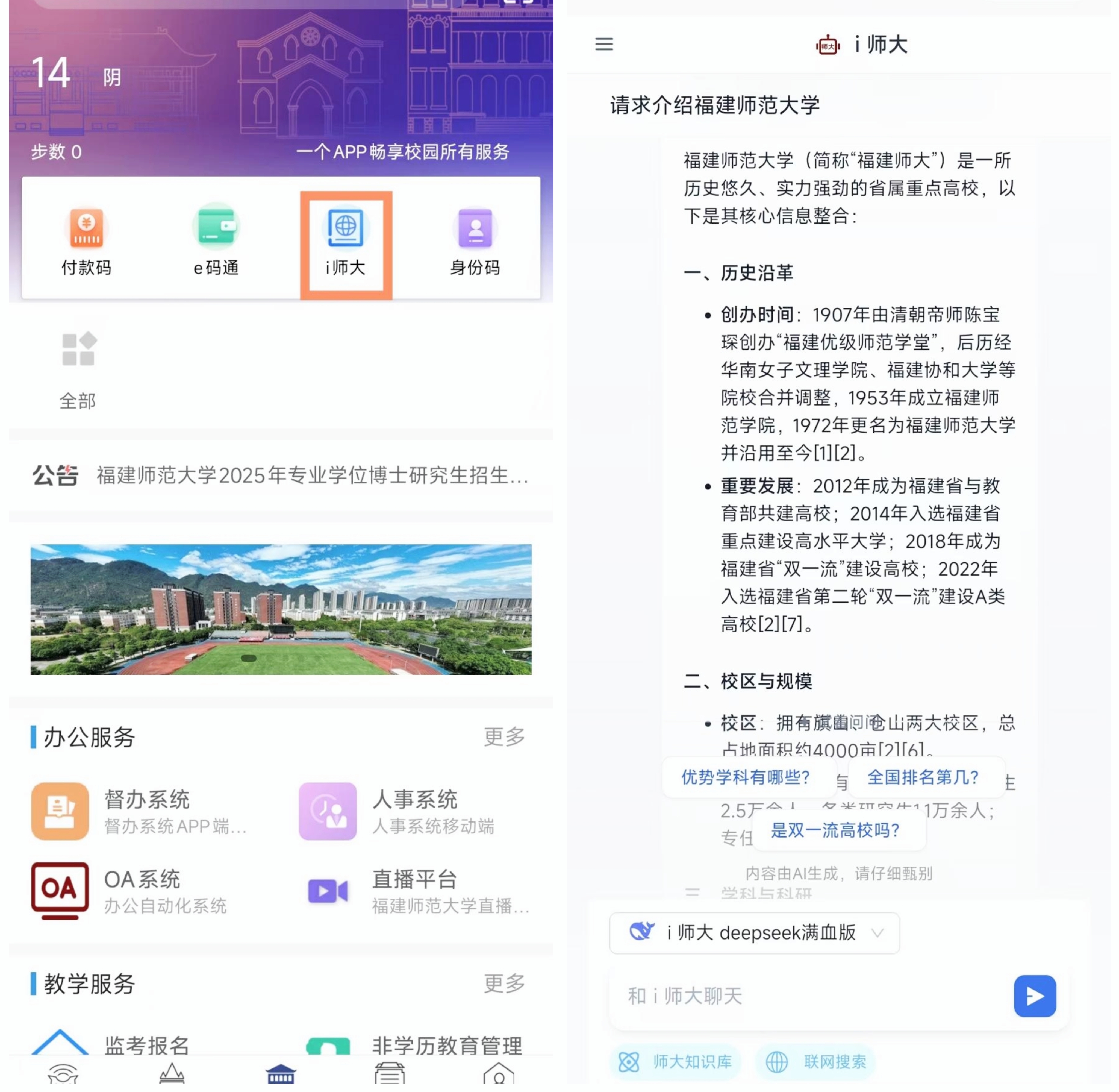 2月26日,基于DeepSeek-R1大模型核心引擎的OD官网“i师大”智能服务平台正式上线。该平台由OD(中国)一站式服务平台网络与数据中心研发部署,采用本地化与云端协同部署双栈融合的模式,集成了教务、学工、招生、后勤、校园网等多个校内场景知识库,依托DeepSeek强大的深度推理与分析能力,可精准处理学术文献解析、创意写作、校园事务咨询等多元化需求,师生可无限次免费体验“满血版”DeepSeek,彻底告别“服务器繁忙”困扰,为全校师生提供安全稳定、优质高效的本地化 AI 服务体验。