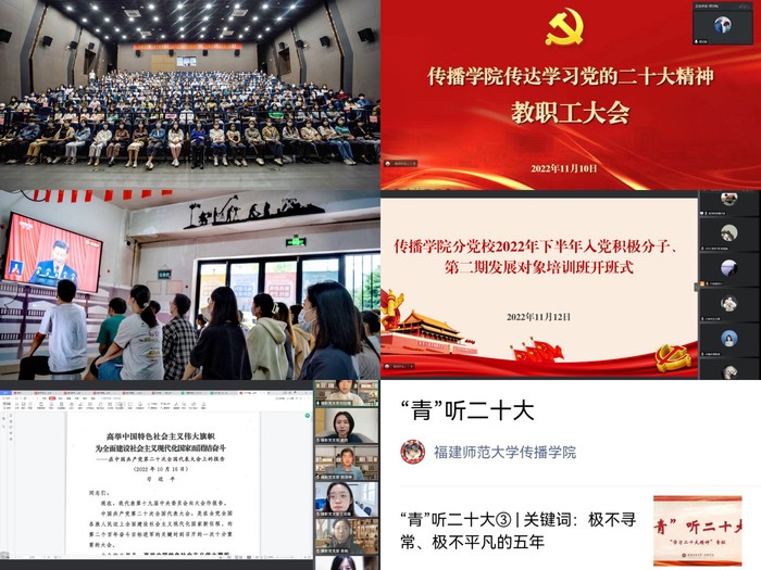 四是全体师生共同深学。11月10日,传播学院线上召开全院教职工大会,学院党委书记郑文灿围绕党的二十大报告主要内容重点领学、再次促学。学院教职员工坚持原汁原味读报告、学党章,把职责摆进去、把工作摆进去,谈认识体会、谈落实举措,表示将在新文科建设、卓越新闻传播人才培养、科学研究等各领域各方面践行育人初心使命。