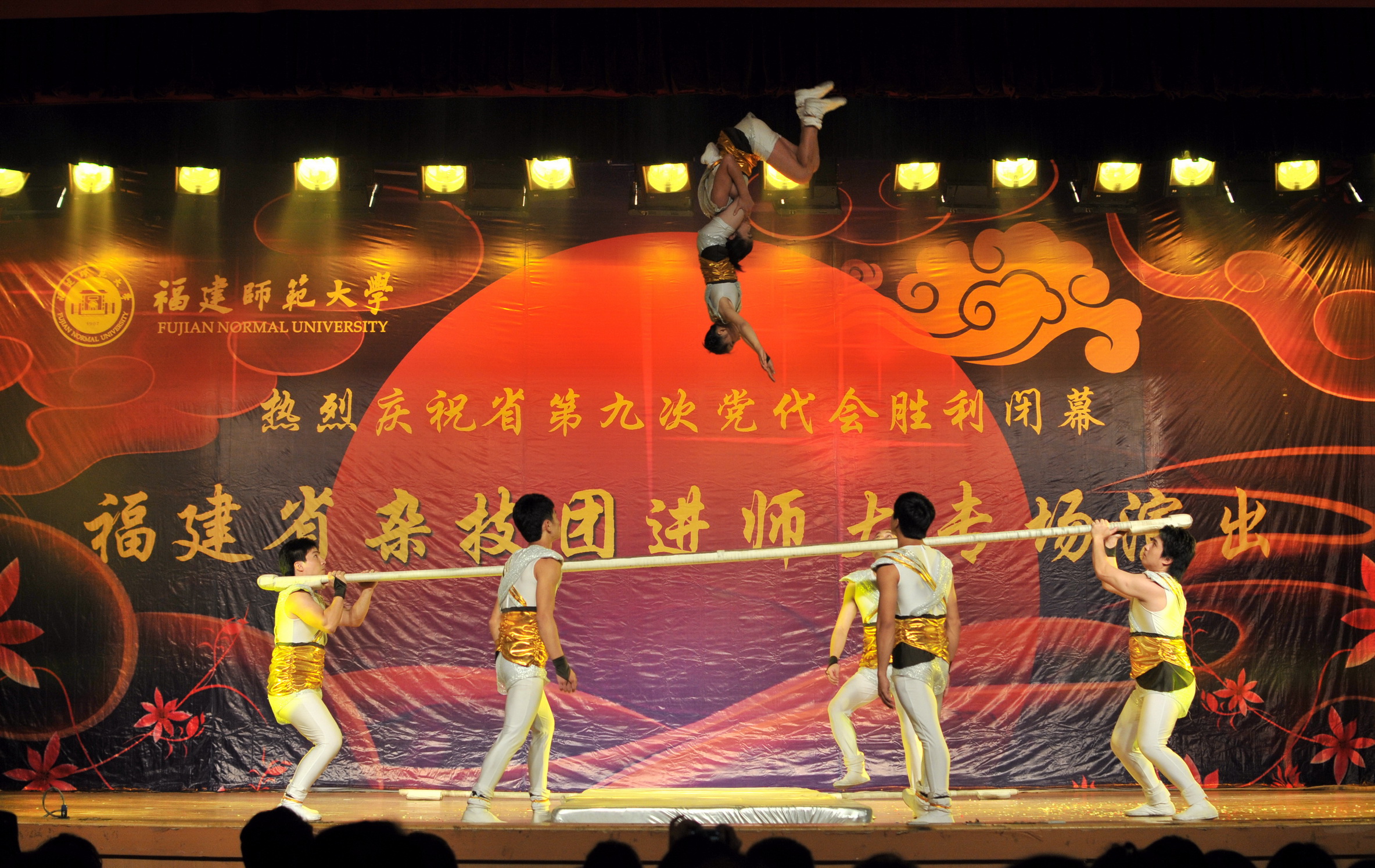 为热烈庆祝福建省第九次党代会胜利闭幕,大力弘扬“爱国爱乡、海纳百川、乐善好施、敢拼会赢”的福建精神,让广大师生共享我省文化发展成果,福建省杂技团进师大专场演出于11月27日晚在旗山校区青春剧场欢乐开场。省文联党组书记处书记、副主席罗训涌,校党委书记罗萤,校纪委书记许歌平,省杂技团团长林防等嘉宾和全校1000多名师生共同观看演出,感受精彩的杂技艺术。