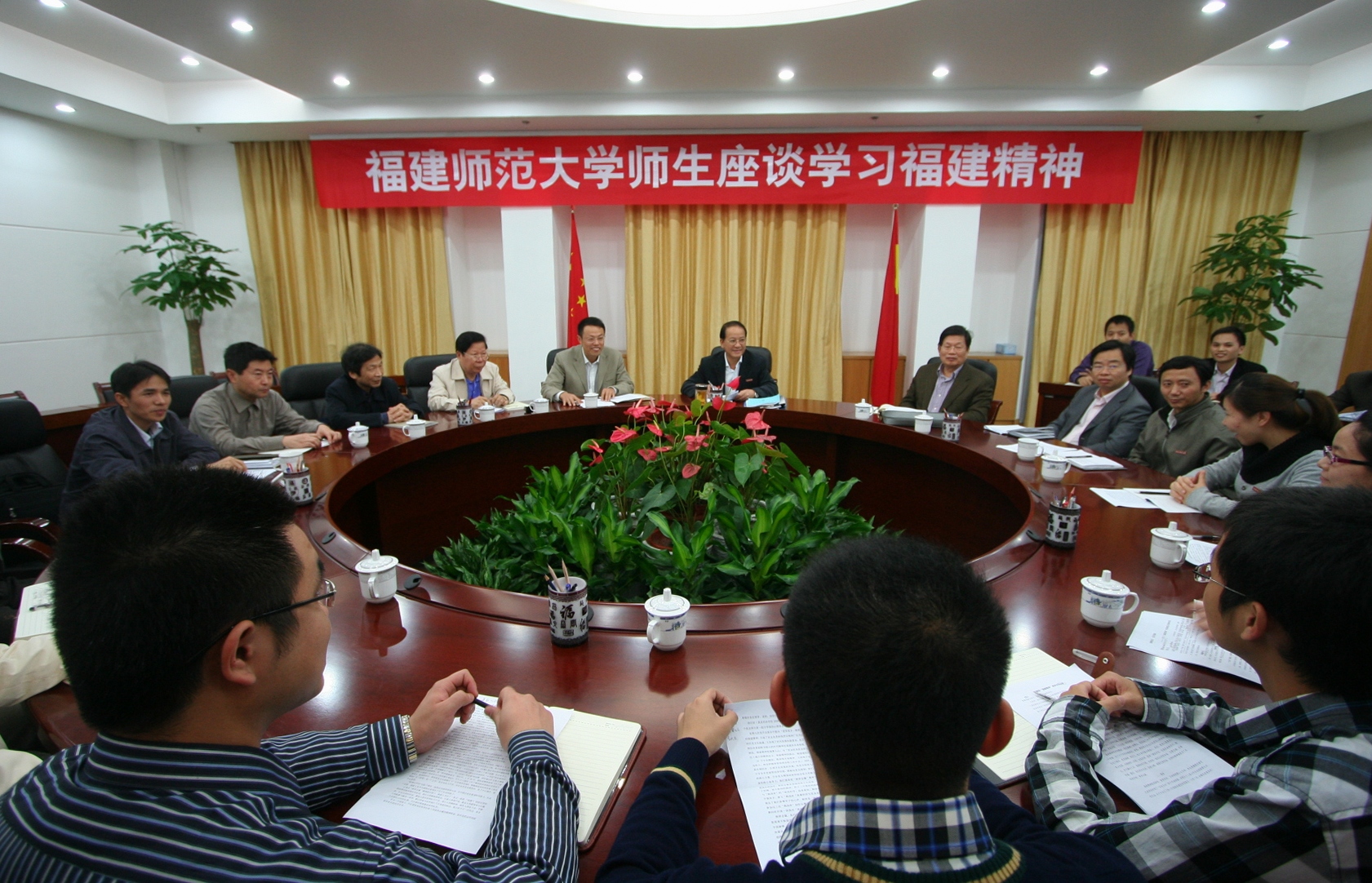 座谈会上,教师代表分别从哲学、历史、文化、经济等多角度对“福建精神”进行了深入的分析和解读,认为“福建精神”内涵丰富、意蕴深刻,既反映了福建独特的历史文化底蕴,又体现了时代发展的新要求,是新时期推动福建科学发展、跨越发展的精神支撑。学生代表分别结合自己的学习生活实际,畅谈学习体会。他们一致认为,作为一名福建的大学生,要争当践行“福建精神”的模范,认真学习,锐意进取,勇于担当,为福建科学发展新跨越作出应有的贡献。