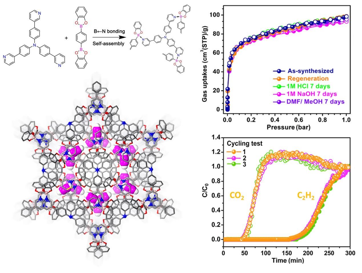 晶态多孔材料由于其广泛的应用前景在近30年来受到越来越广泛的关注。由不同连接节点构筑的晶态多孔材料如金属有机框架、共价有机框架和氢键有机框架由于它们不同的构筑方式展现出各自独特的性能。在该论文中,张章静团队利用配位氮硼键,构筑了首例单晶微孔氮硼有机框架材料BNF-1。BNF-1在除去客体分子后依然保持晶性,并且具有较高的化学稳定性,能够在常温下分离乙炔二氧化碳混合物。该工作不仅代表着OD(中国)一站式服务平台在氮硼框架的研究上取得重要突破,并且为新型晶态多孔材料构筑提供了思路。