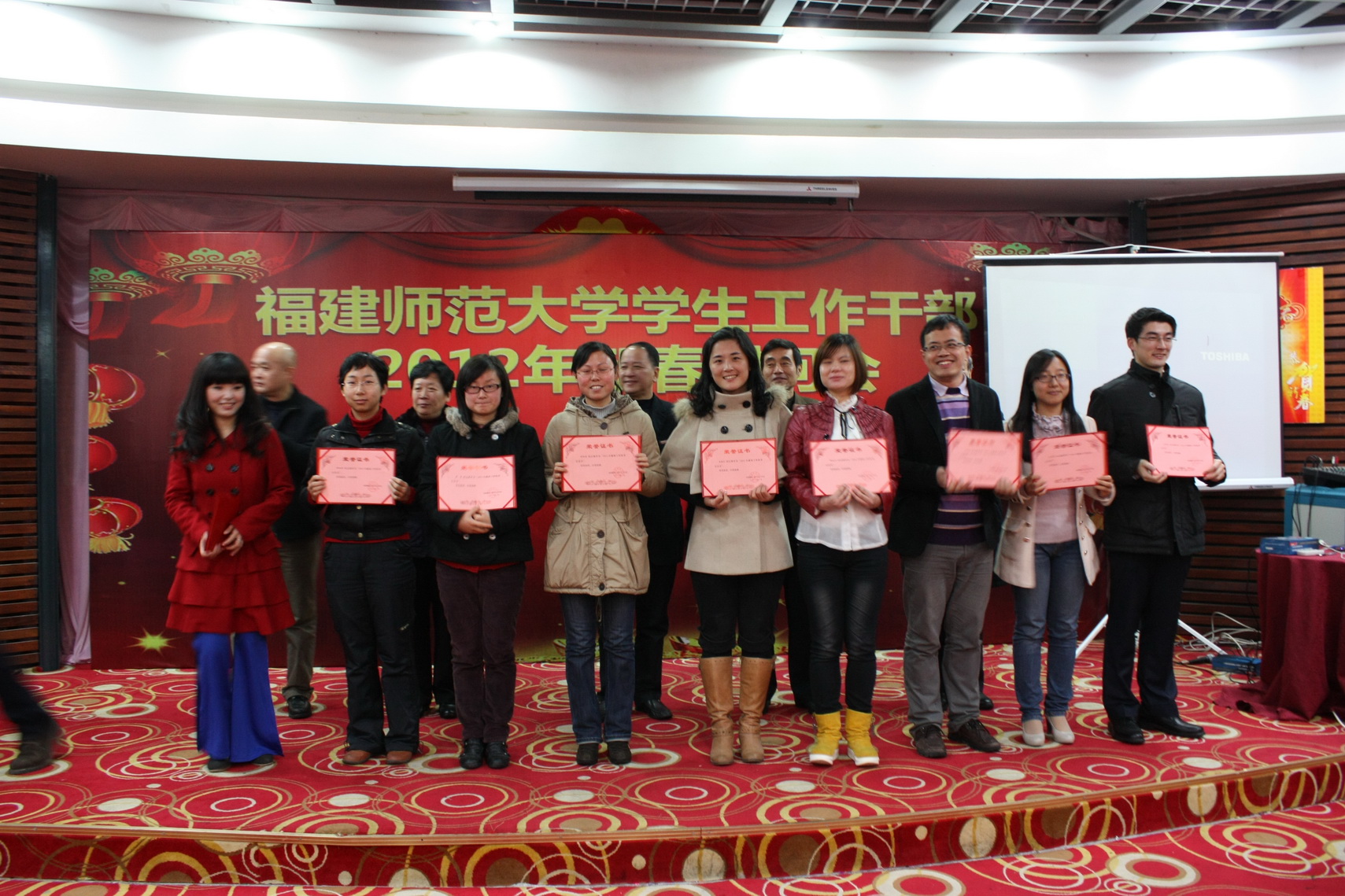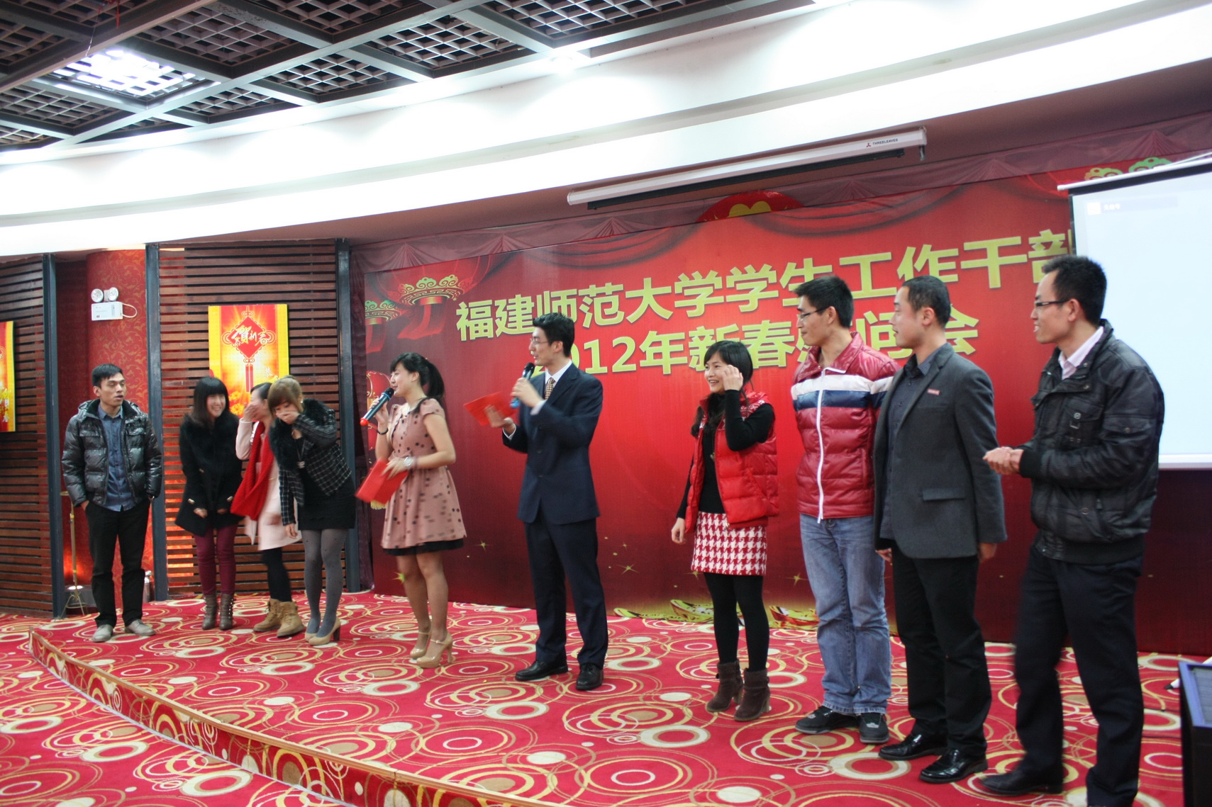 新春慰问会于1月9日晚举行。校领导罗萤、黄汉升、游小波、许歌平、许明、凌启淡,校关工委、学校办公室负责人,学工部、研工部、校团委全体干部,各学院分管学生工作负责人,全校辅导员欢聚一堂,共庆新春。