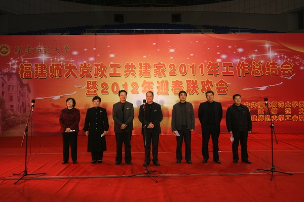 联欢会于1月13日晚在仓山校区综合体育馆举行。省教科文卫体工会张元闽副主任、福州市总工会朱琴厦副主席、福州市总工会直属工会侯贞诚主席,校领导罗萤、黄汉升、游小波、许歌平、汪文顶、李敏、凌启淡,原校领导,原校长助理,各单位党政主要负责人,省人大、省政协委员,校各民主党派、统战团体、无党派人士联谊会负责人,国务院学位委员会学科评议组成员,全国博士后管委会专家评审组召集人,国家有突出贡献中青年专家,百千万人才工程国家级人选、国家级教学名师,教育部高校优秀青年教师,教育部新世纪优秀人才支持计划入选者,省优秀专家,省引进高层次创业创新人才,“闽江学者”特聘教授、讲座教授,博士生导师,校关工委、退休协会、老年大学负责人,原校工会专职主席,人武学院、福清分校、附中、附小党政工负责人,校工会、教代会委员、经审委员,各部门工会主席,师生代表300余人参加了联欢会。大家欢聚一堂,总结、庆贺辛勤耕耘、硕果累累的2011年,共同谋划和展望充满希望和挑战的2012年。