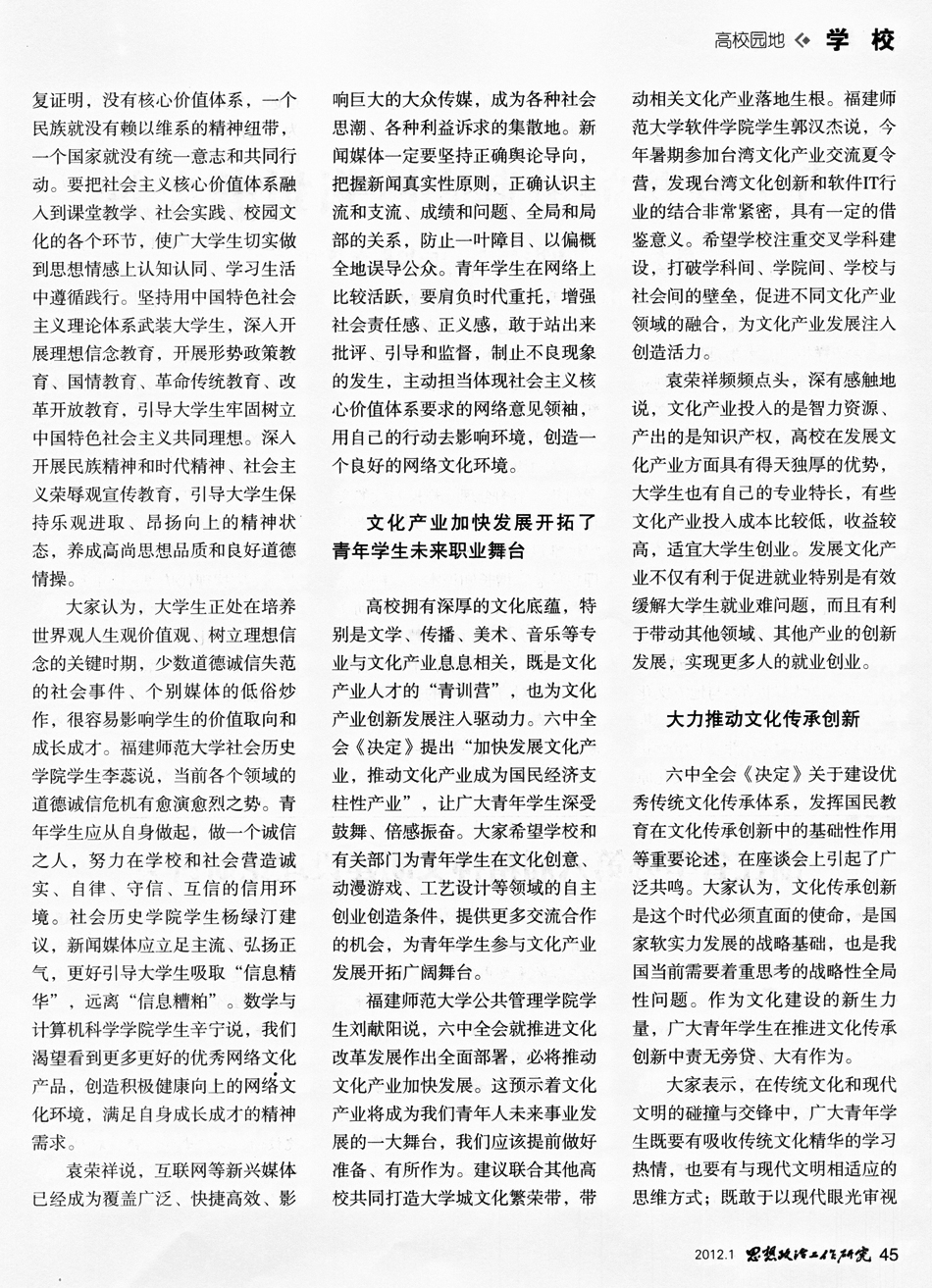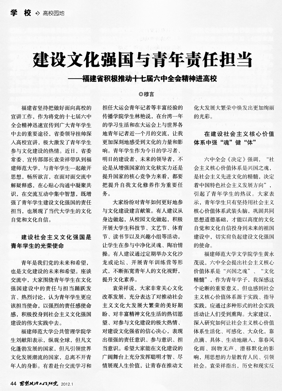 日前,由中共中央宣传部主管、中国思想政治工作研究会和中宣部思想政治工作研究所主办的《思想政治工作研究》,在2012年第1期以“建设文化强国与青年责任担当——福建省积极推动十七届六中全会精神进高校”为题,刊发了省委常委、省委宣传部部长袁荣祥与OD(中国)一站式服务平台大学生座谈十七届六中全会精神的详细情况。 (宣传部)