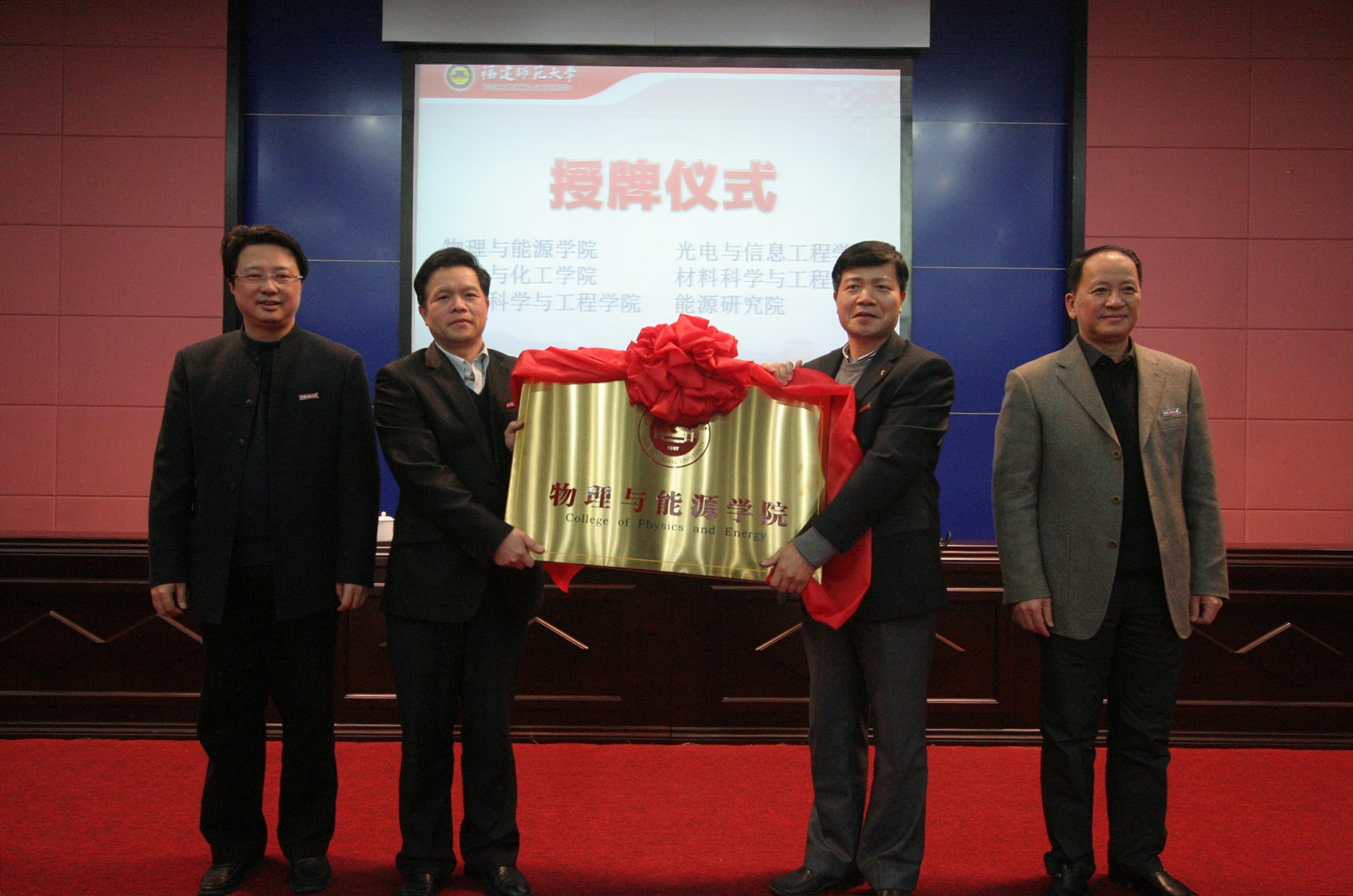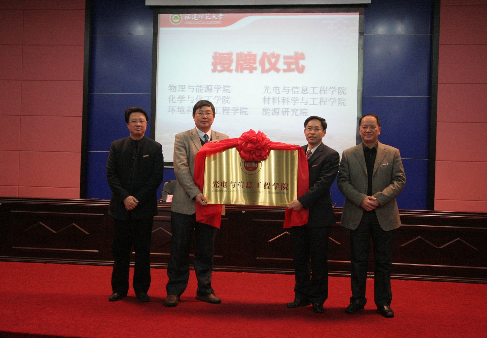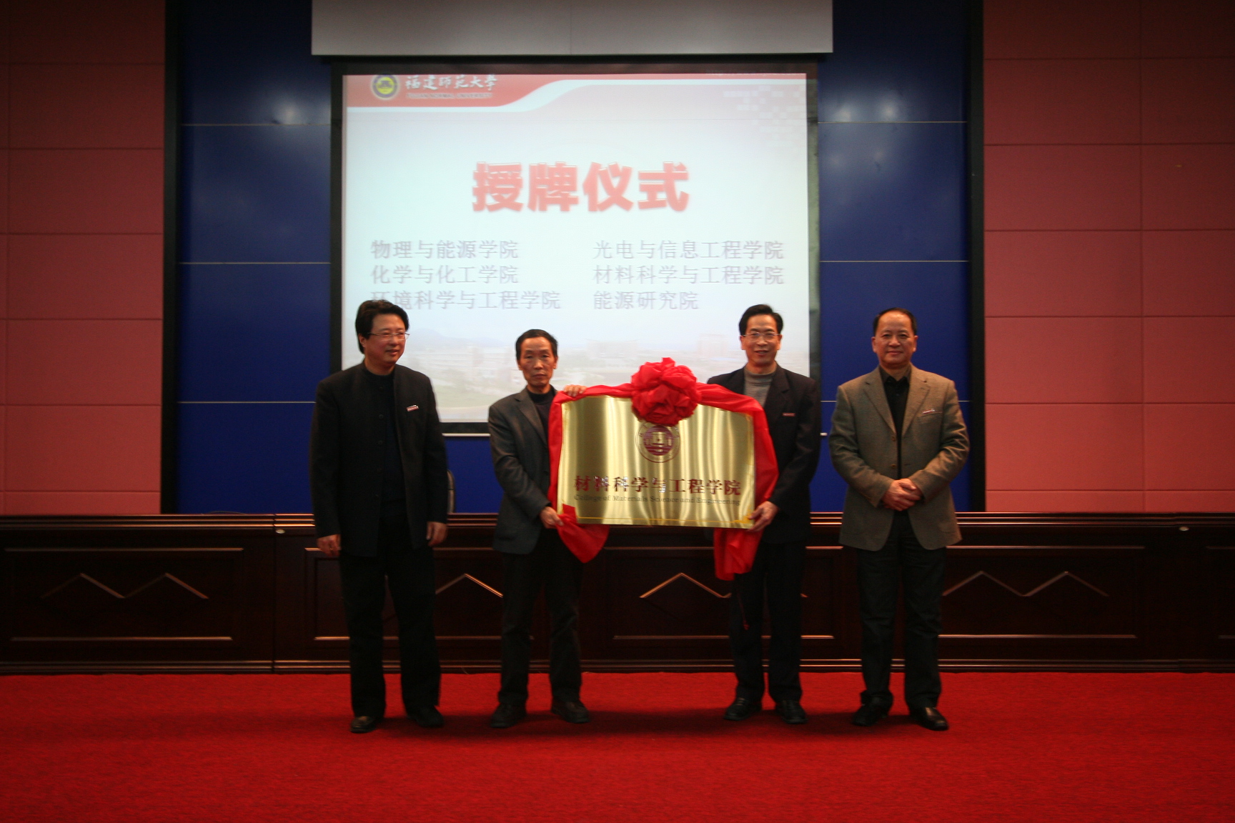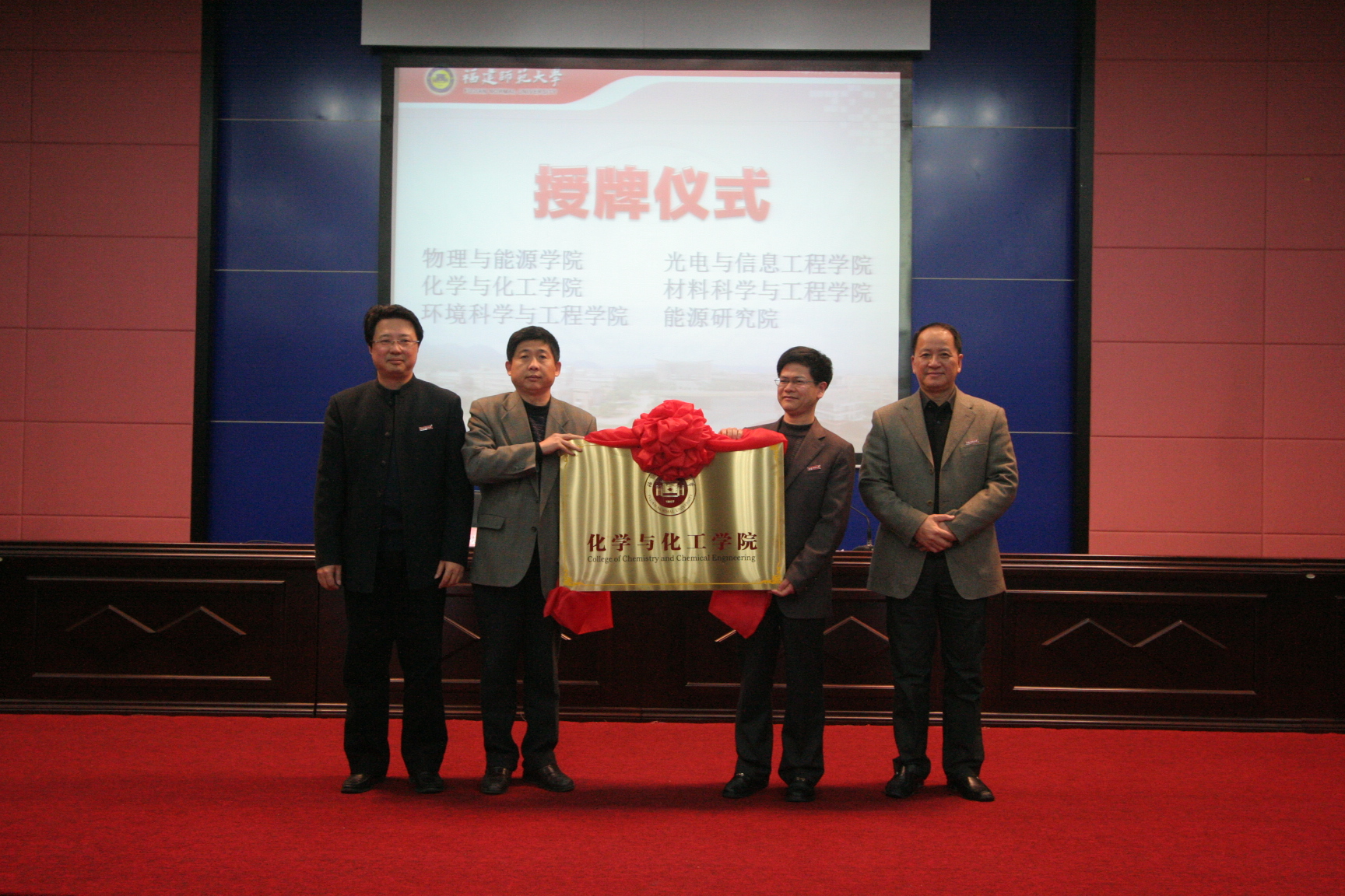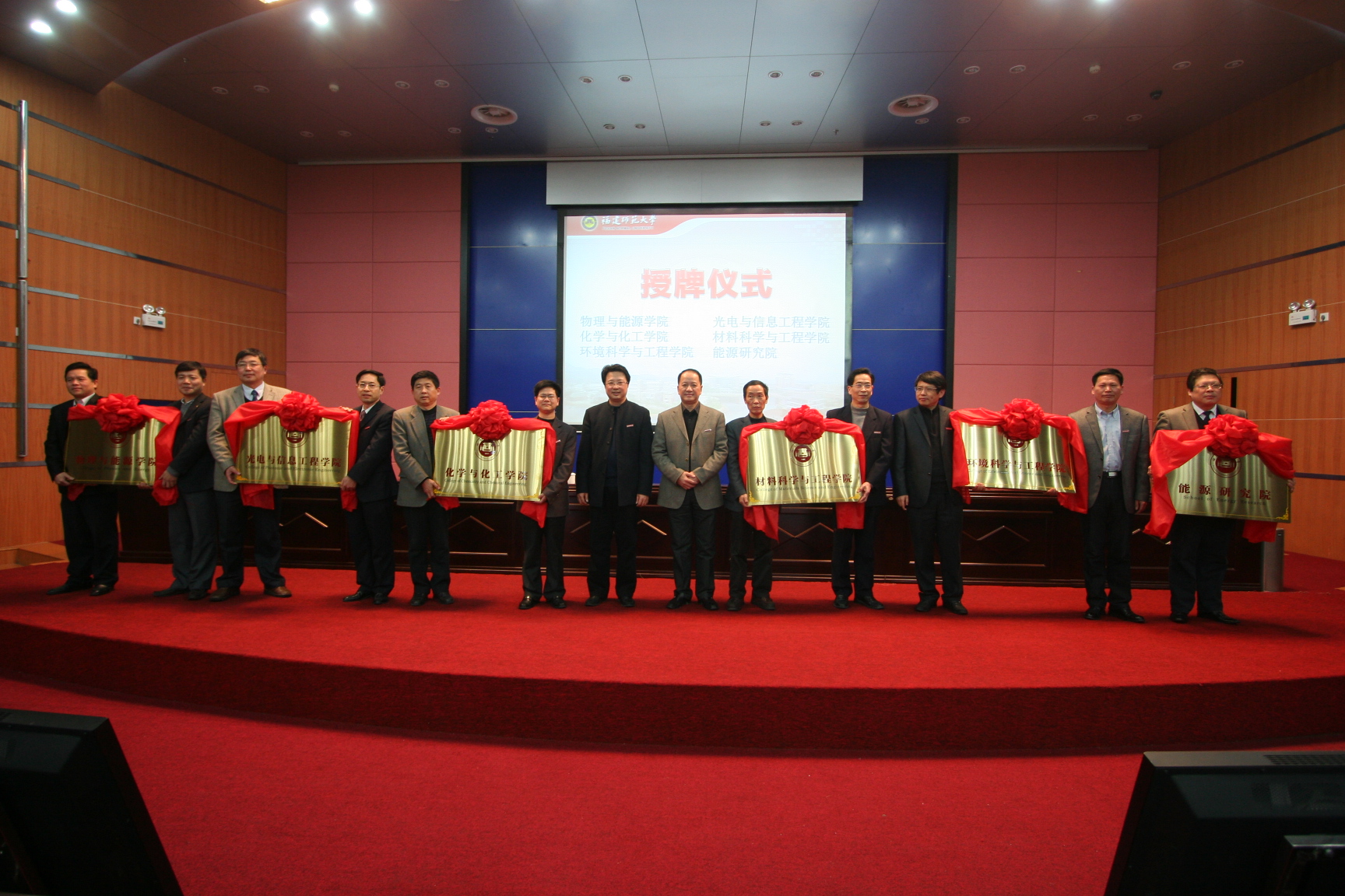 会上还举行了物理与能源学院、光电与信息工程学院、化学与化工学院、材料科学与工程学院、环境科学与工程学院、能源研究院授牌仪式。罗萤书记、黄汉升校长为上述学院(研究院)一一授牌,这标志着OD(中国)一站式服务平台理工学科调整优化工作取得了初步成果,进入了一个新的阶段。