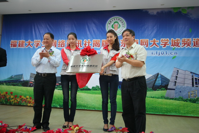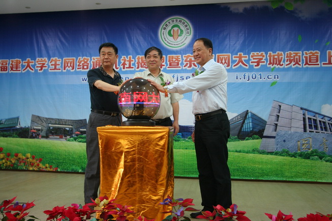 活动现场,卢承圣与罗萤为福建大学生网络通讯社揭牌。卢承圣、梁建平、罗萤共同点击开通东南网大学城频道。