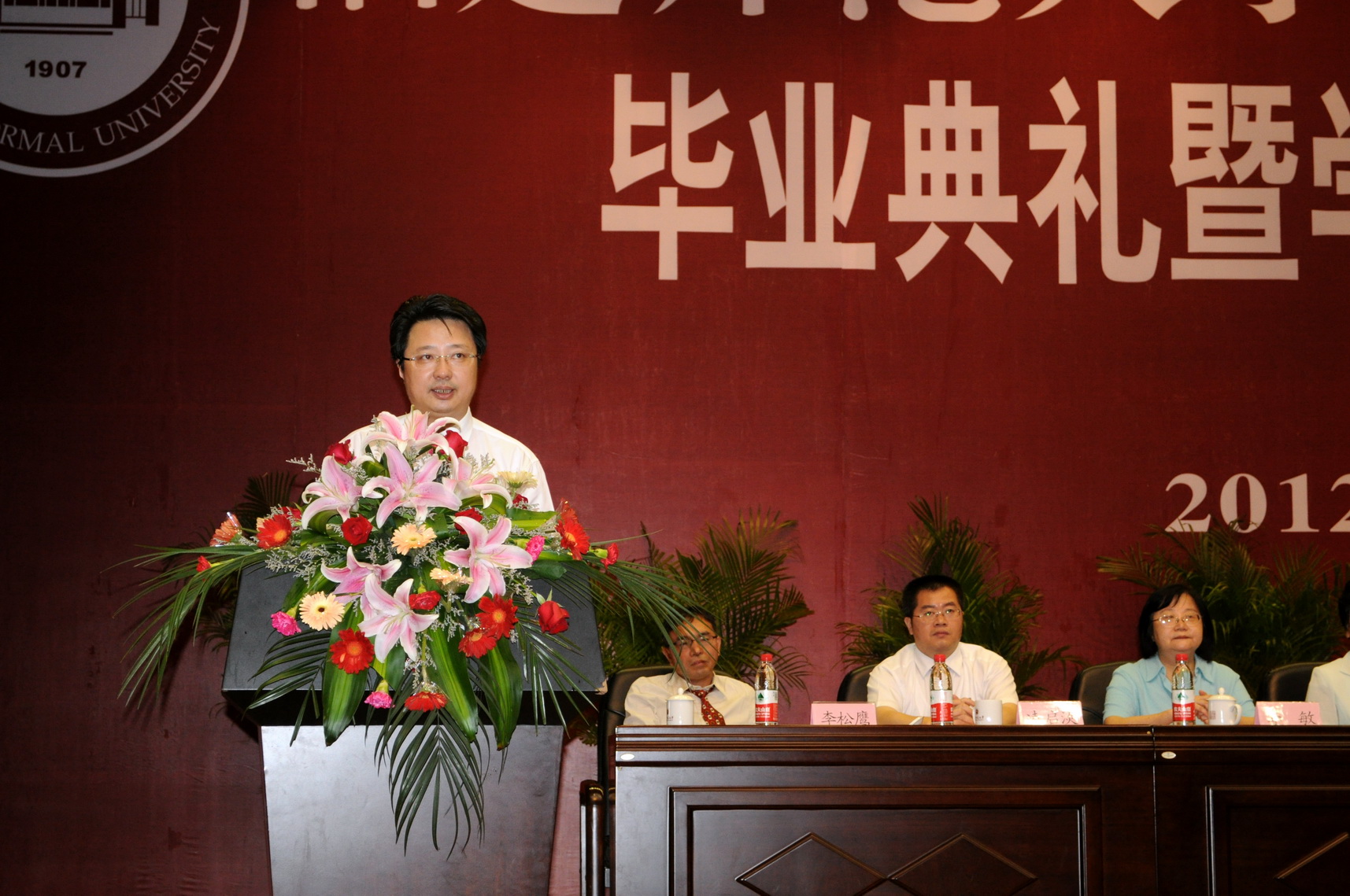 黄校长向2012届研究生提出三点希望:一是做勤学善思的践行者。希望大家怀揣追求真理的信念,多读书、读好书,多思考,多研究,在平凡的工作岗位上做出不平凡的业绩。二是做行胜于言的推动者。希望大家发扬历代师大人的优良传统,珍惜美好青春年华,脚踏实地,奋力拼搏,以实际行动谱写辉煌的人生篇章。三是做理想之路的先行者。希望大家坚守自己的理想,树立新的目标,拉高自己的标杆,自强不息,永不自满,努力走在时代的前列,成为国家的栋梁,社会的中坚。