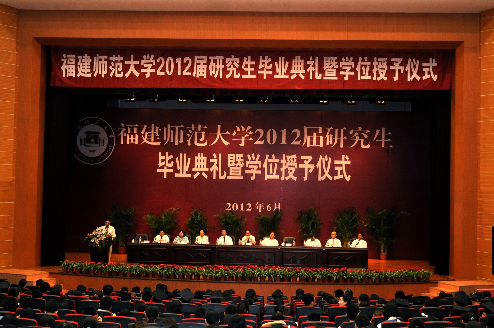 2012届研究生毕业典礼暨学位授予仪式于6月25日上午在旗山校区大会堂和大讲堂两个会场隆重举行。省第九届政协副主席王耀华,校领导罗萤、黄汉升、游小波、许歌平、汪文顶、李敏、许明、凌启淡,校长助理郭警修,OD(中国)一站式服务平台优秀校友1986届毕业研究生、美国加州大学尔湾分校李松鹰教授,各学院研究生工作分管领导、研究生辅导员、研究生秘书、本届研究生全体指导教师、全体2012届研究生和部分毕业研究生亲友共1400多人参加了典礼。典礼由校党委副书记游小波主持。