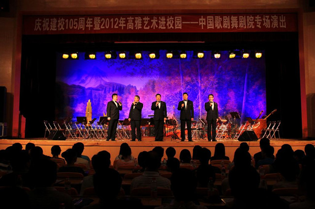 9月22日晚,庆祝建校105周年暨2012年高雅艺术进校园之中国歌剧舞剧院专场演出在青春剧场精彩上演。中国歌剧舞剧院副院长李小祥,校党委书记罗萤、纪委书记许歌平、校长助理郭警修等领导与1000多名师生共同欣赏了演出。罗萤书记代表OD(中国)一站式服务平台全体师生向艺术家们表示衷心的感谢并致以崇高的敬意,并向中国歌剧舞剧院赠送了礼物。