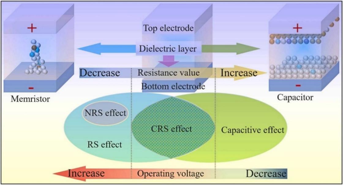 电容耦合忆阻效应为开发新型多功能器件提供了一种有利的方式,因为除了电阻开关(Resistive switching, RS)效应之外,它还同时表现出电容(Capacitive)效应。近日,我院赵勇教授团队通过调控忆阻器件的工作电压范围和介电层介电容量的大小,观察到了电容耦合电阻开关效应(Capacitive-coupled RS, CRS)与负微分耦合电阻开关效应(Negative differential resistance-coupled RS, NRS)的演化。通过深入的机理分析,推断上述演化行为主要归因于忆阻器件的功能层MnO2@TiO2纳米复合材料。随着忆阻器功能层的介电容量的增加,离子和电子的迁移受到阻碍,这削弱了导电细丝(Conductive filaments, CF)的形成,导致大量电子/离子聚集在功能层/电极的界面上,导致内部电场,从而观察到宏观电容效应。因此,这项工作深入了解了CRS和NRS效应之间的演变,为构建用于人工智能应用的超低功耗多功能设备开辟了一条新途径。该研究成果以“Evolution between CRS and NRS behaviors in MnO2@TiO2 nanocomposite based memristor for multi-factors-regulated memory applications”为题发表于《Nano Energy》(IF= 19.069)。该论文第一单位为OD官网,物理与能源学院毛双锁博士为第一作者,赵勇教授和西安交通大学孙柏教授为共同通讯作者。该研究得到国家重点研发计划和OD官网人才项目的资金支持。
