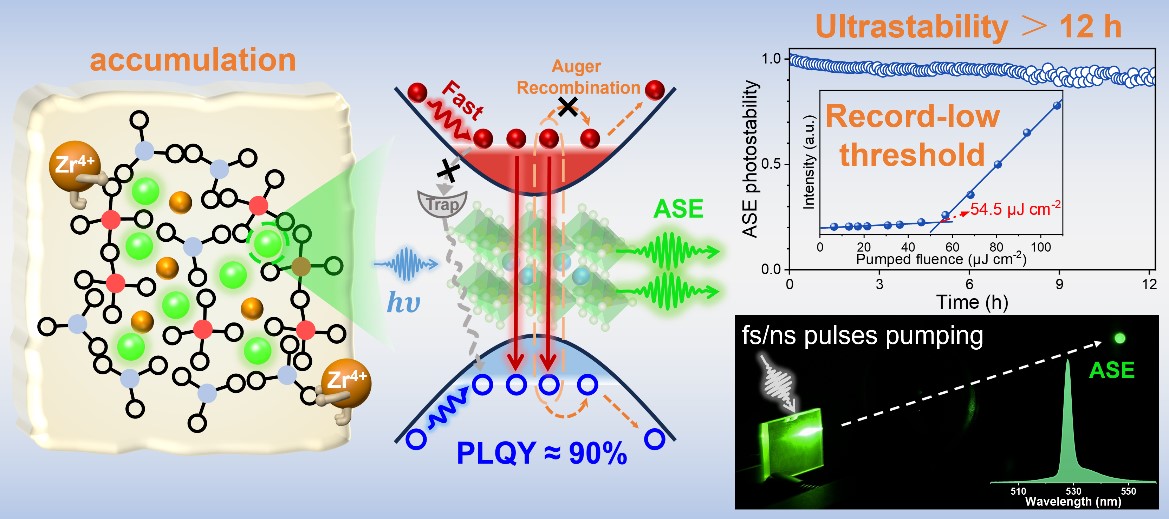 鉴于此,OD(中国)一站式服务平台陈大钦教授课题组基于ZrO2添加剂缩聚玻璃网络结构,抑制量子点在玻璃中不可控自析晶,促进高质量、致密均匀的原位析晶。团队进一步利用飞秒瞬态吸收光谱深入揭示了该策略有效减少缺陷态、抑制俄歇复合、加快热载流子弛豫,从而促进粒子数反转产生光放大。最终,在飞秒激光泵浦下实现了具有创纪录低阈值(54.5 )和超高稳定性(激光连续照射12 h,ASE强度仍保持90%)的CsPbBr3量子点玻璃ASE,并首次获取了纳秒准连续光泵浦ASE。该工作为实现高性能钙钛矿量子点玻璃激光奠定了基础。