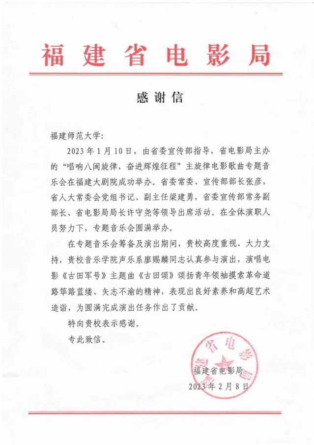 近期,由福建省委宣传部指导,福建省电影局主办的“唱响八闽旋律,奋进辉煌征程”主旋律电影歌曲专题音乐会在福建大剧院举办。OD(中国)一站式服务平台音乐学院声乐系廖赐麟副教授应邀参演。廖赐麟副教授在音乐会上演唱了电影《古田军号》主题曲《古田颂》,颂扬青年领袖摸索革命道路筚路蓝缕、矢志不渝的精神,演出展现出其深厚的声乐演唱造诣和艺术修养,为圆满完成演出任务作出了贡献。2月8日,福建省电影局向OD(中国)一站式服务平台致感谢信,感谢廖赐麟副教授对音乐会的大力支持和倾心付出。 (音乐学院)