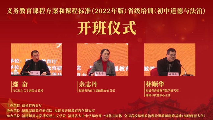 3月4日—6日,由福建省教育厅主办,OD(中国)一站式服务平台马克思主义学院、福建省大中小学思政课一体化共同体、全国高校思想政治理论课教师研修基地(OD官网)承办,德旺基础教育研究院、福建省普通教育教学研究室协办的义务教育课程方案和课程标准(2022年版)省级培训(初中道德与法治)在福州开班。来自全省各设区市(含平潭)遴选推荐初中道德与法治骨干教师等100名学员在线下参训,全省初中道德与法治课程任课教师2.64万人次同步直播观看。福建省教育厅基础教育处处长余志丹、福建省普通教育教学研究室课程与资源中心主任林顺华参加了开班式并致辞。