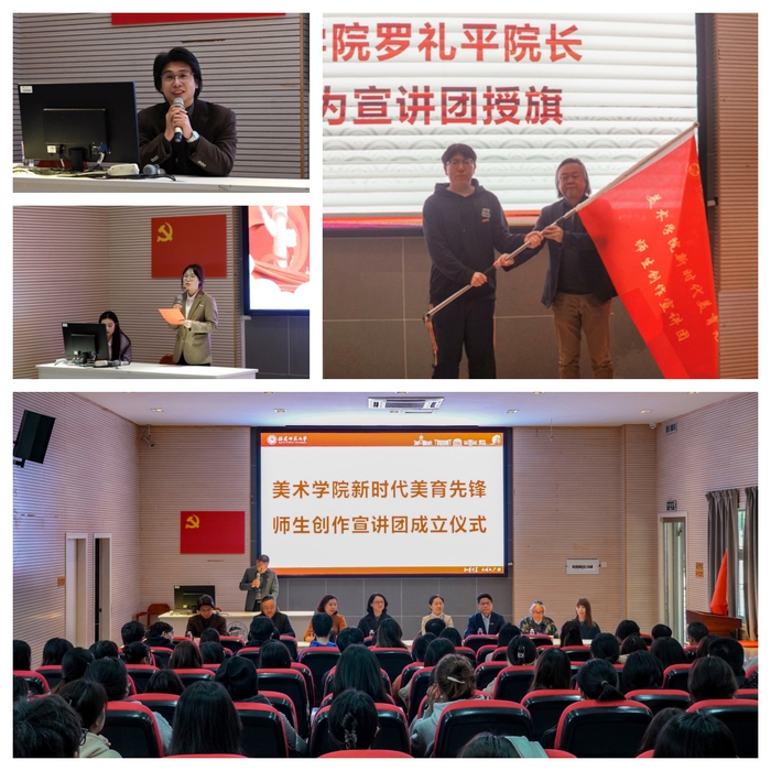 会上,副院长王英暎宣读了成立美术学院新时代美育先锋师生创作宣讲团的通知,院长罗礼平为宣讲团授旗,与会领导分别为宣讲团师生代表颁发聘书。
