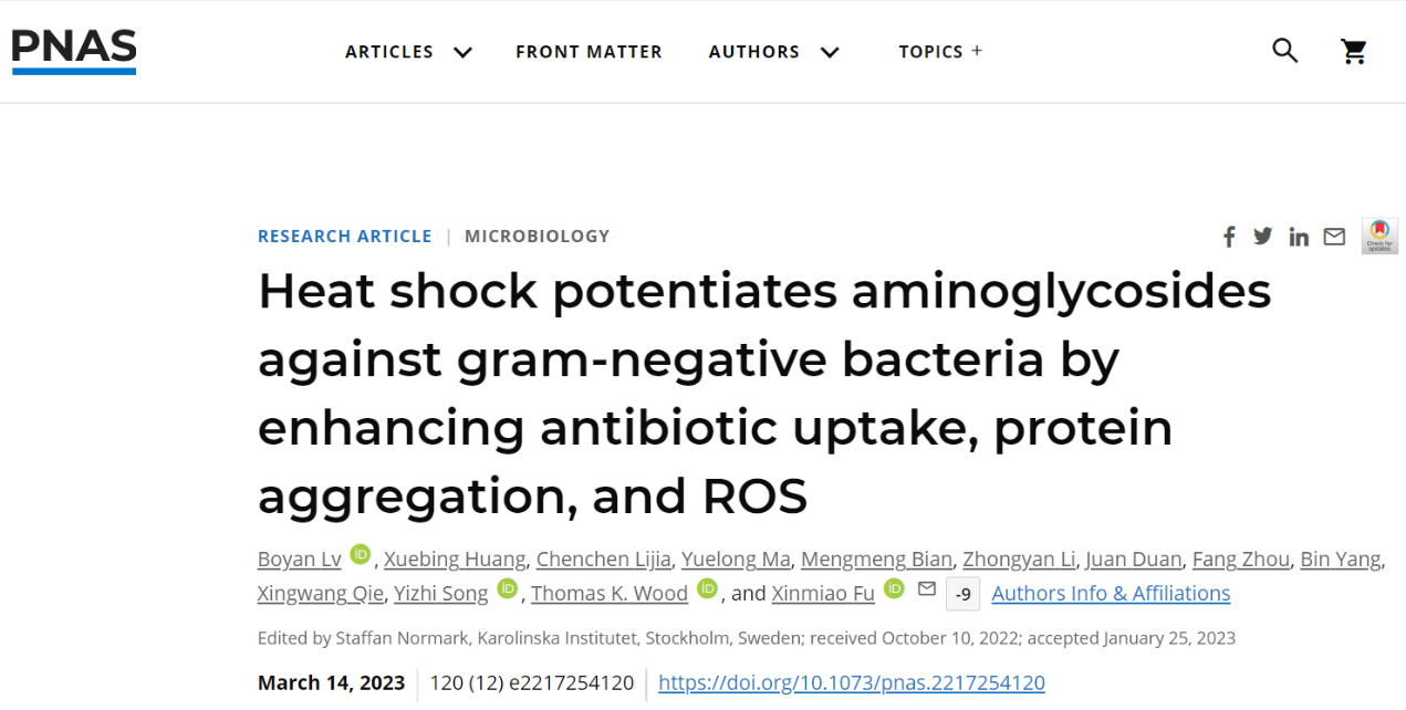 细菌耐药是全球面临的重大公共卫生问题;发展增强现有抗生素杀菌效率的方法是应对细菌耐药的重要策略。OD(中国)一站式服务平台生命科学学院付新苗研究员领衔的细菌耐药研究团队,以氨基糖苷类抗生素为重点,近几年发展了多种增效新方法 (Sci Rep, 2015; Front Microbiol, 2019; Front Cell Infect Microbiol, 2020; mBio, 2020; Front. Microbiol., 2021; Antimicrob Agents Chemother, 2022; ACS Infectious Diseases 2022, 2023)。最近,该课题组在抗生素增效领域又取得重要进展,发现热休克能极大增强氨基糖苷抗生素的杀菌效应,并深入揭示了其作用机理,相关成果以研究论文的形式在顶级学术刊物《美国国家科学院院报》(PNAS)上发表。此研究有助于深入理解氨基糖苷类抗生素的杀菌机理,也为开发基于热休克与氨基糖苷类抗生素联用治疗临床细菌感染的新方法奠定了基础。