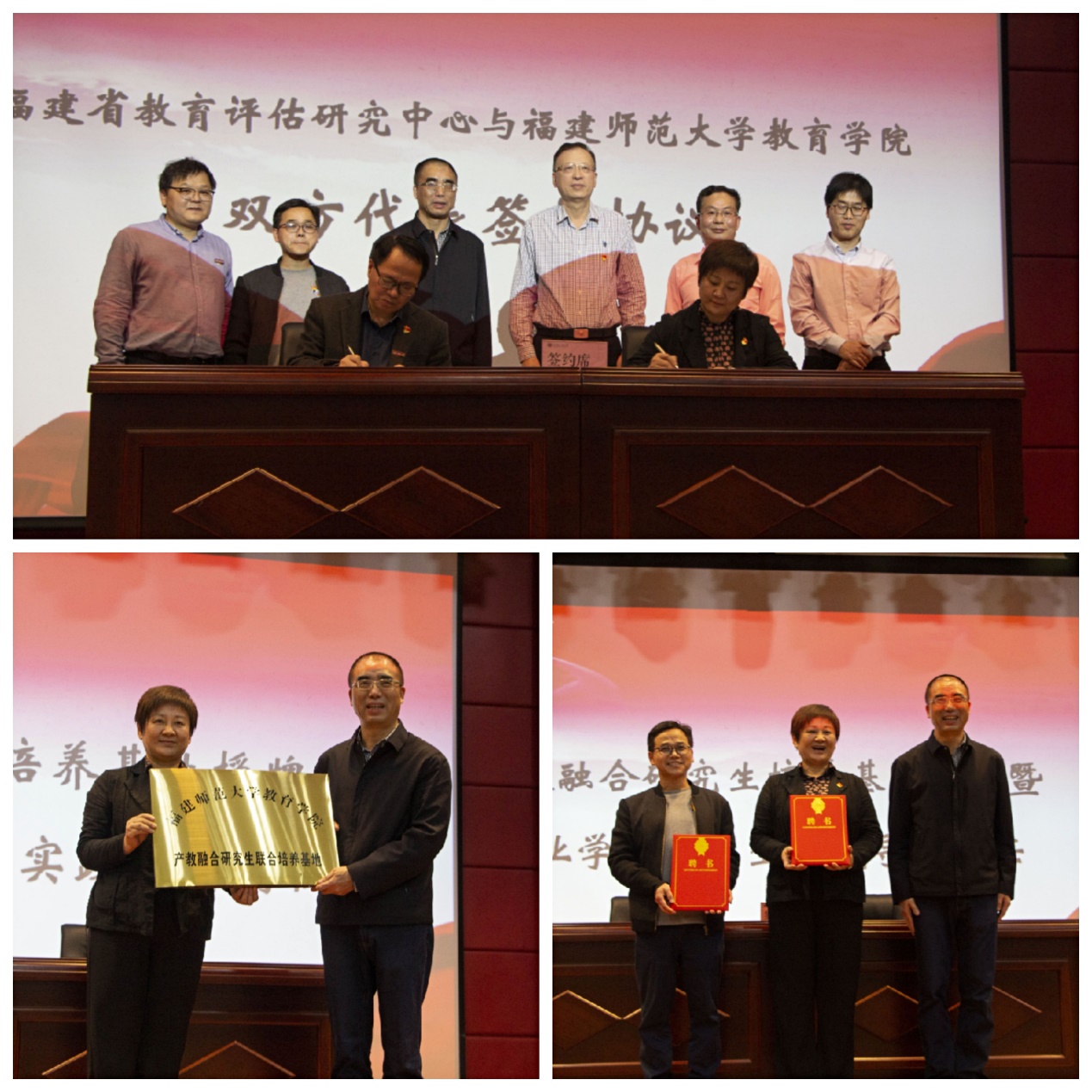 活动现场,OD(中国)一站式服务平台教育学院党委书记林伟川、福建省教育评估研究中心主任范菁作为双方代表签署了合作框架协议。郑家建为福建省教育评估研究中心授予“OD官网教育学院研究生联合培养基地”牌匾,并为范菁、王长旺颁发专业学位研究生实践导师聘书。