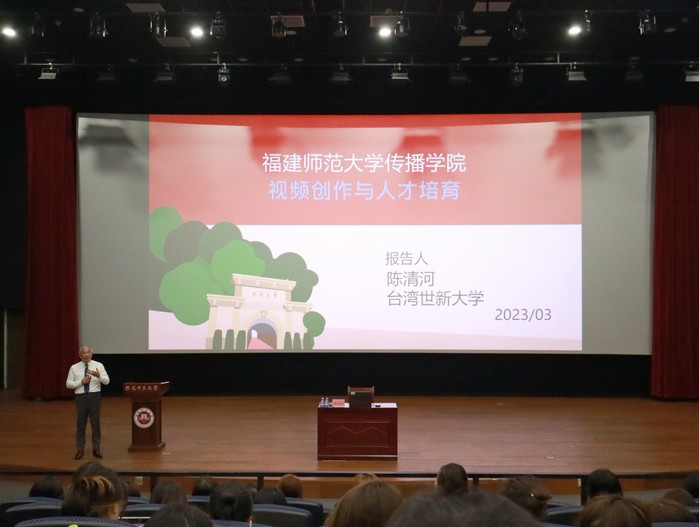 近日,传播学院邀请台湾世新大学校长陈清河教授在星雨剧场开展题为《视频创作与人才培养》的讲座。学院领导谢宗贵、谢秀俤、连水兴,相关专业教师以及本科生学生代表等参加活动。讲座中,陈清河教授详细介绍了世新大学顺应新时代媒体融合发展趋势,引进专业设备和技术,鼓励广大学子跨域学习,重视传媒专业课程建设和师生的原创IP内容研发等系列举措。讲座最后,陈清河教授热情地回答了现场学生提出的关于专业技能、业界情况等相关问题。讲座获得师生一致好评。(传播学院)