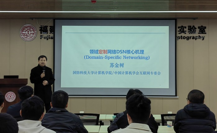 3月29日下午,计算机与网络空间安全学院邀请国防科技大学苏金树教授为师生作题为《领域定制网络DSN核心理念》的讲座。讲座由院长许力教授主持,学院部分教师和研究生到场聆听。