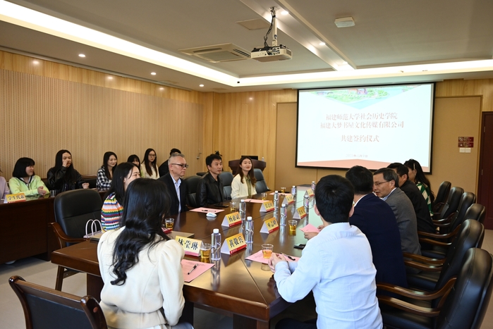 近日,社会历史学院与福建大梦书屋文化传媒有限公司在领先楼举行教学实践基地共建签约仪式。学院党委副书记虞永飞、大梦书屋副总经理张连旺、学院图书情报硕士点负责人傅文奇教授以及双方代表、部分学生参加了活动。