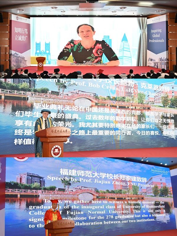 鲍勃·克莱恩向全体毕业生及家长致以诚挚祝贺,回顾了两校合作历史,指出近年来两校在人才培养、学术交流等领域不断深化合作,取得了令人瞩目的办学成果。他表示,本届毕业生是哈德斯菲尔德大学的全球校友,学校珍视与校友建立的终身情谊,期待他们在更广阔的学术天地续写华章,让两校情缘历久弥新。