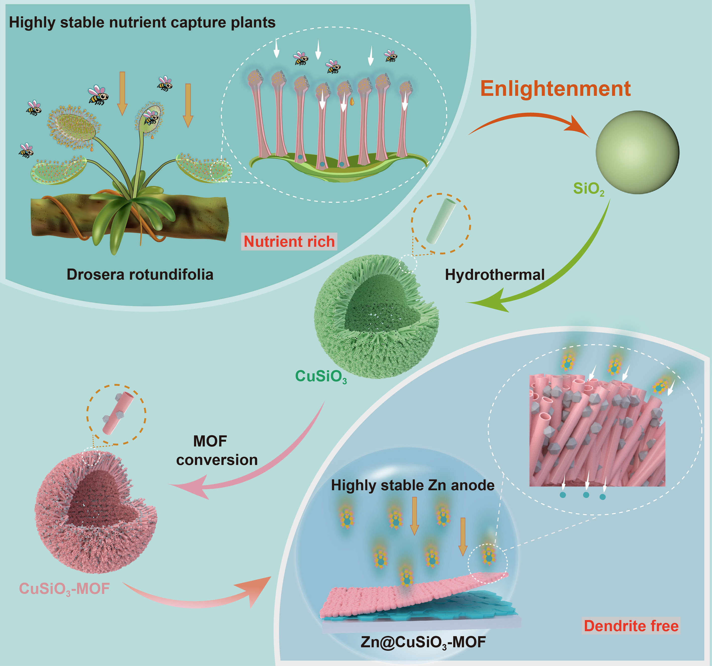 为解决这些挑战,OD(中国)一站式服务平台赵毅研究员团队从圆叶茅膏菜的生物机制和共生结构中汲取灵感,提出了一种原位MOF转化构建的分级中空CuSiO3-MOF杂化材料。这种仿生杂化材料作为锌负极人工保护层,可为锌负极提供优异的结构稳定性、丰富的亲锌位点、强大的去溶剂化能力和快速的离子迁移能力,从而实现高度稳定的无枝晶锌沉积/剥离过程,并有效抑制与水相关的副反应。在低电流密度下,Zn@CuSiO3-MOF对称电池展现出超过3500小时的超长循环寿命。即使在45%和90%的高放电深度下,该电池仍分别保持1200小时和400小时的稳定循环性能,显著优于大多数已报道的MOF修饰负极。此外,以MnO₂和C@V₂O₃为正极的全电池表现出卓越的循环性能和倍率性能,进一步凸显Zn@CuSiO3-MOF负极在电网储能和可穿戴电子设备中的实际应用潜力。这一仿生策略为构建稳定MOF基杂化材料用于高性能锌金属负极提供了一种可行的方法。研究成果以“A Biomimetic Copper Silicate-MOF Hybrid for Highly Stable Zn Metal Anode”为题,发表于材料顶级期刊《Advanced Materials》。