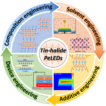 锡基钙钛矿发光二极管(PeLEDs)在实现高性能环保发光器件方面表现出卓越潜力,受到研究者们的广泛关注。近年来,锡基PeLEDs在器件效率、光谱可调性和长期工作稳定性方面取得了显著突破。然而,Sn²⁺易氧化特性和钙钛矿层的快速结晶动力学严重制约了其进一步发展——Sn²⁺氧化会导致p型掺杂特性,而快速结晶会引发高缺陷密度,二者共同造成光致发光量子产率(PLQY)低下和电荷注入失衡问题。因此,深入理解氧化与结晶过程是推动卤化锡PeLEDs发展的关键。