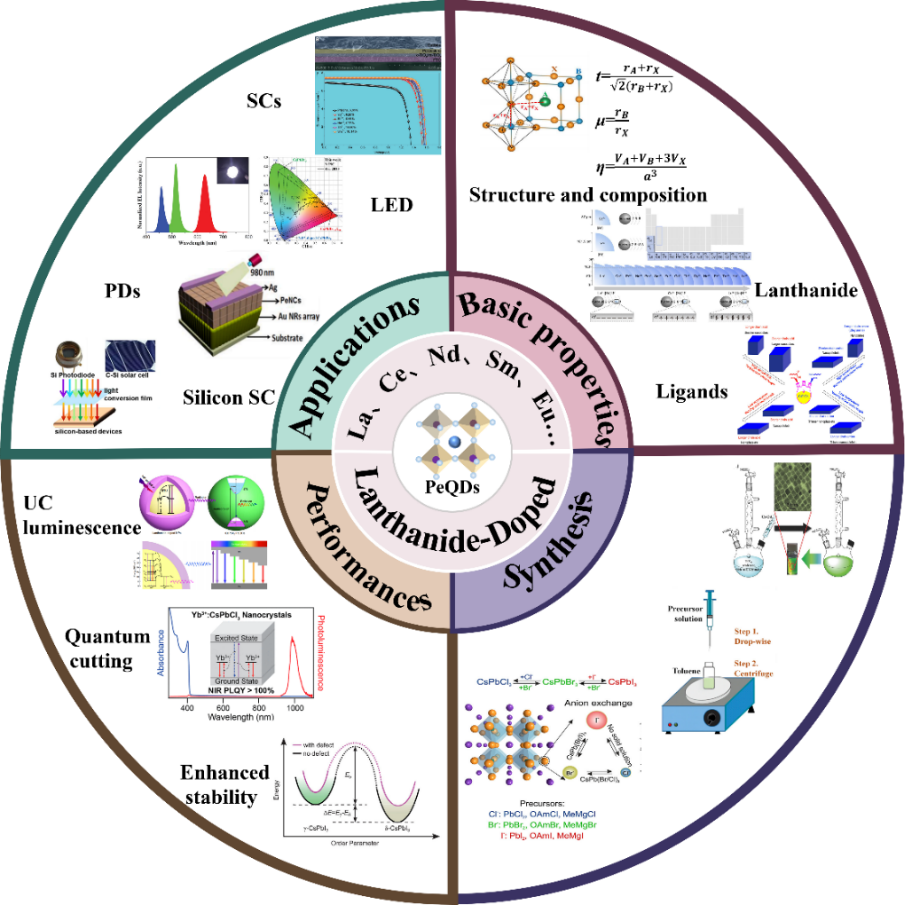 钙钛矿纳米晶以其独特的光学性质在发光材料领域展现出巨大潜力。近年来,杂质掺杂钙钛矿纳米晶在发光效率、光谱调控和稳定性等方面取得了令人瞩目的进展。其中,基于镧系离子独特的电子构型、丰富的能级以及长衰减寿命等优点,镧系掺杂钙钛矿纳米晶在上转换发光、量子剪裁发光、缺陷钝化及稳定性增强等方面取得重大进展。但是,镧系掺杂过程中的配体工程复杂性以及纳米晶在不同环境条件下的稳定性问题,仍然是其面临的重大挑战。因此,深入探究配体与镧系掺杂钙钛矿纳米晶之间的相互作用,以及镧系离子在钙钛矿晶格中的稳定机制,对于提升镧系掺杂钙钛矿纳米晶的综合性能和拓展其实际应用范围至关重要。
