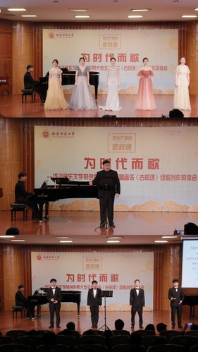 在充分理解作品后,音乐学院学生深情演绎了《古田颂》组歌中的三首作品——《五龙飞歌》《喊声父亲》和《烧炭客之歌》,以艺术形式重走红色之旅,重现先烈们抛头颅、洒热血的奋斗历程,用歌声感悟古田会议的重大历史意义和光荣传统,体会“星星之火,可以燎原”的革命真理,坚定跟党走的信念。